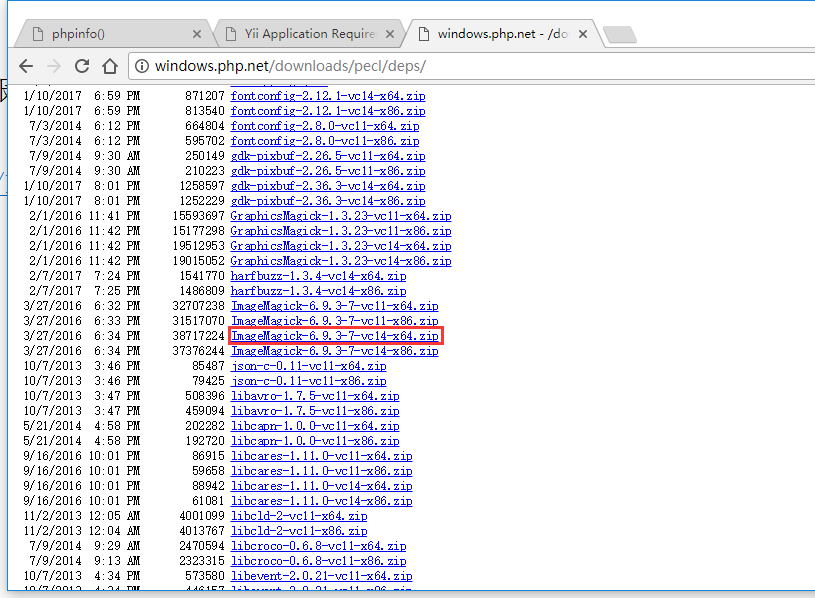 8、仍然报错,打开:http://windows.php.net/downloads/pecl/deps/ ,下载:ImageMagick-6.9.3-7-vc14-x64.zip,如图8