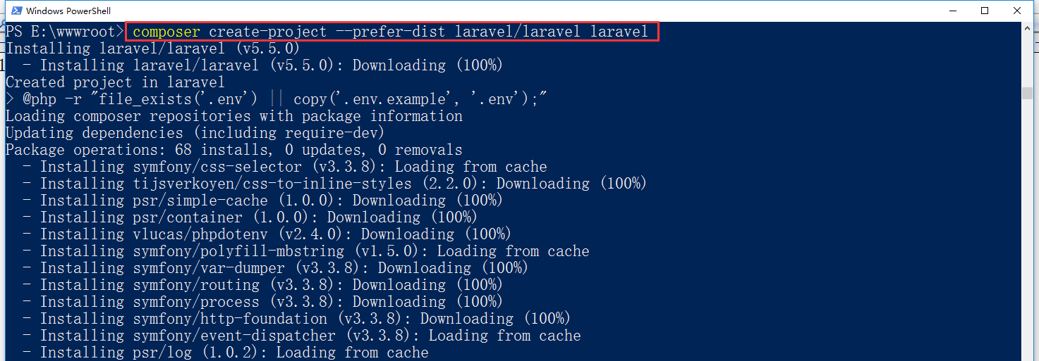 1、通过 Composer 在命令行运行 create-project 命令来安装 Laravel,运行命令:composer create-project –prefer-dist laravel/laravel laravel,如图1