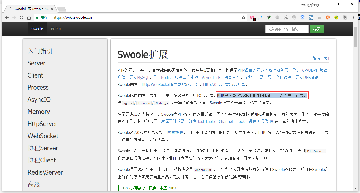 6、刷新网址:https://wiki.swoole.com/ ,使用鼠标选中的部分,其背景颜色已经调整为深蓝色,且文字颜色为白色,对比明显,如图6
