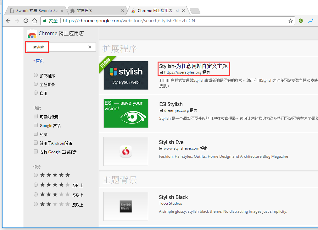 3、在 Chrome 应用商店中搜索 Stylish,将 Stylish-为任意网站自定义主题 添加至 CHROME,如图3