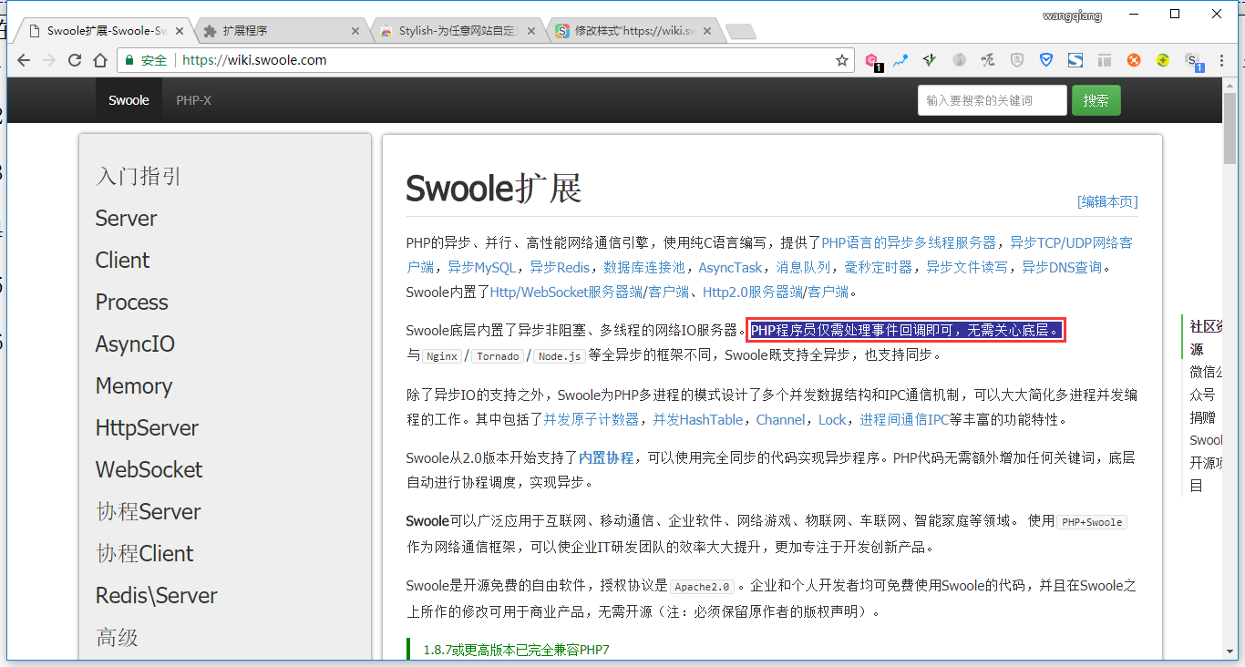 在 Chrome 浏览器中,浏览 Swoole 官方文档,使用鼠标选中的部分,调整其背景颜色