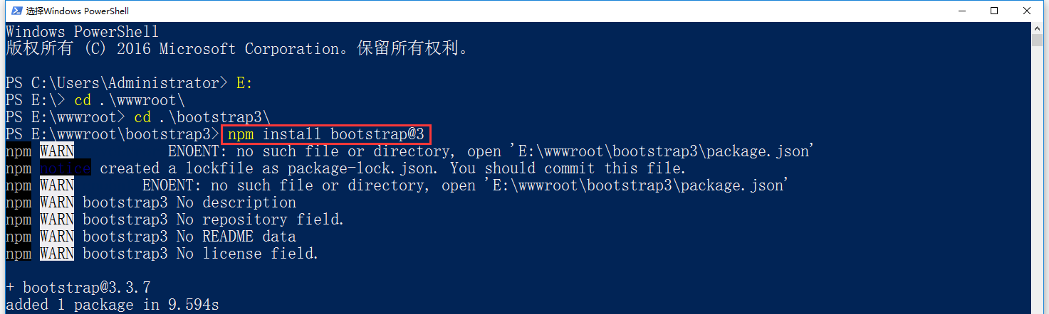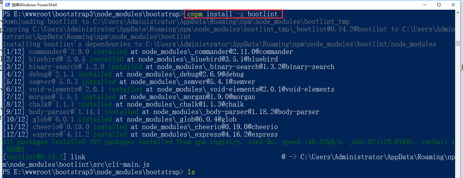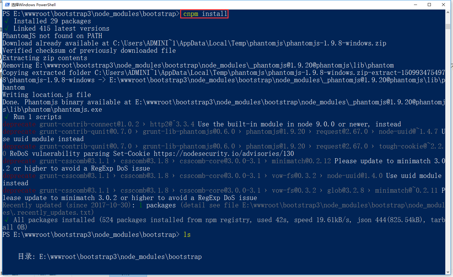 (2)进入 /bootstrap/ 根目录,然后执行 cnpm install 命令。npm 将读取 package.json 文件并自动安装此文件中列出的所有被依赖的扩展包。
