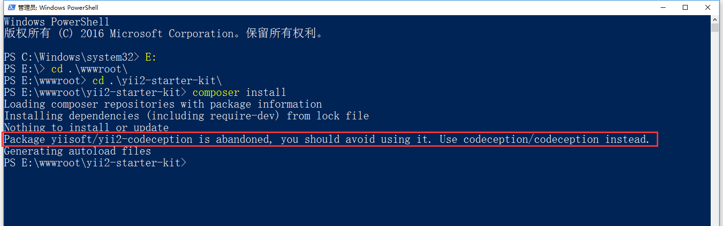 1、composer install 时,提示:Package yiisoft/yii2-codeception is abandoned, you should avoid using it. Use codeception/codeception instead.,如图1