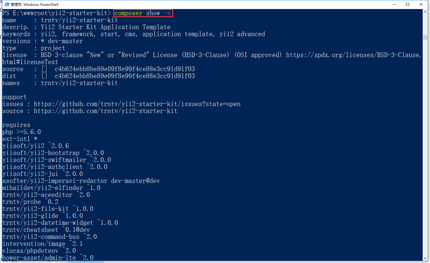 2、执行命令:composer show -s,仅列出当前项目信息,如图2