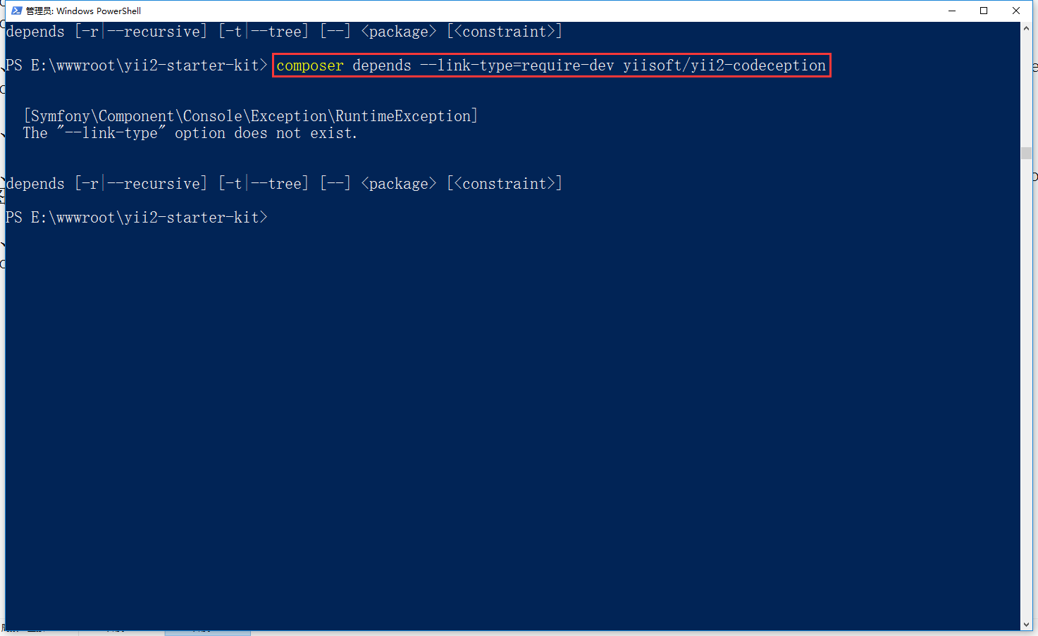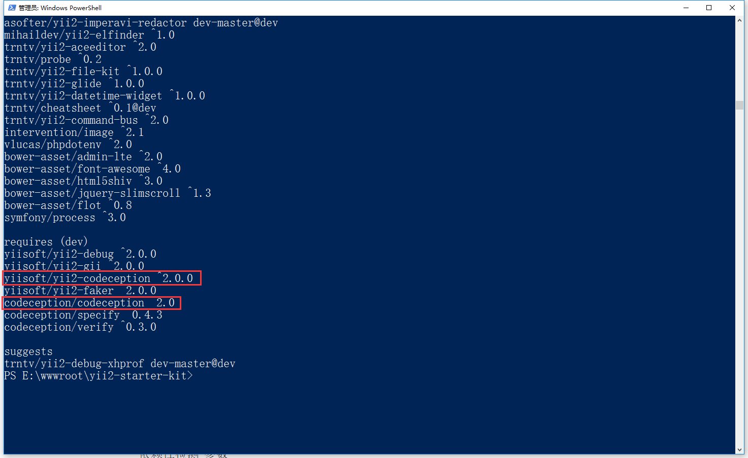 4、查出已安装在你项目中的 yiisoft/yii2-codeception,是否正在被其它的包所依赖,并列出他们,如图4