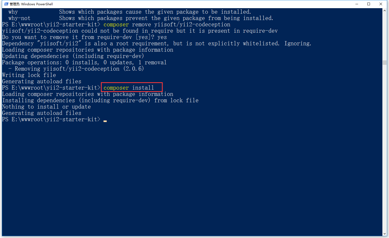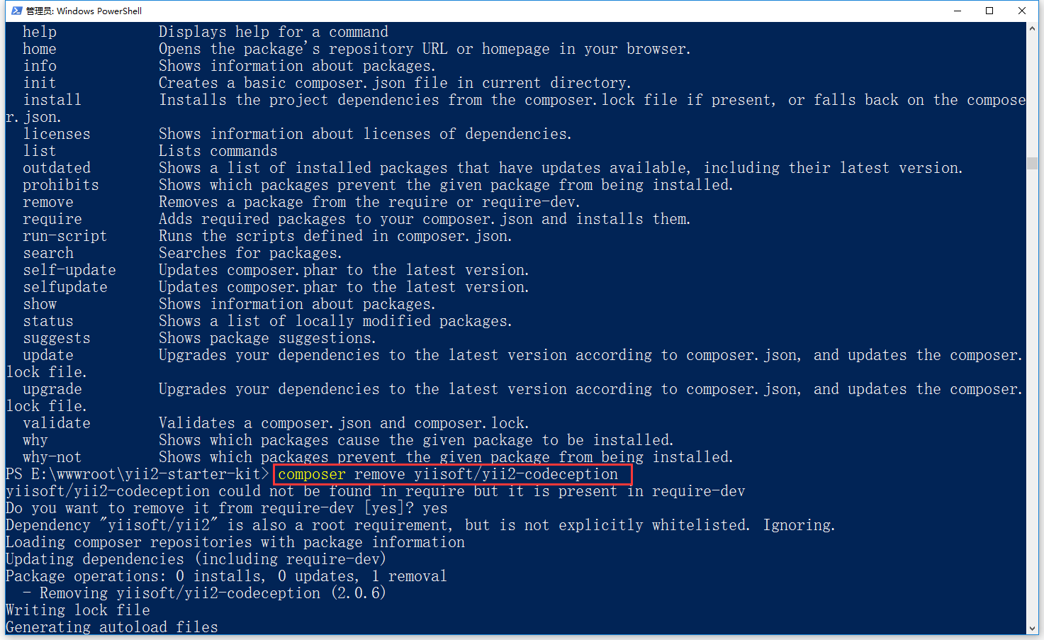 5、执行命令:composer remove yiisoft/yii2-codeception,删除 yiisoft/yii2-codeception,如图5
