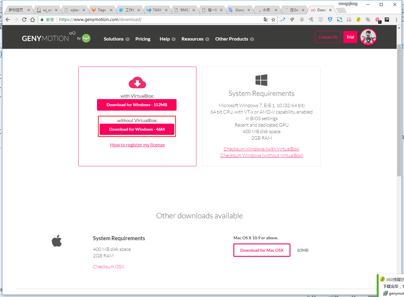 1、打开网址:https://www.genymotion.com/download/ ,由于已经安装了 Oracle VM VirtualBox,所以选择 without VirtualBox,如图1