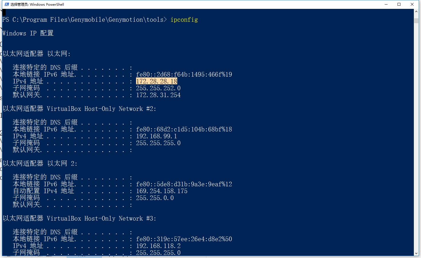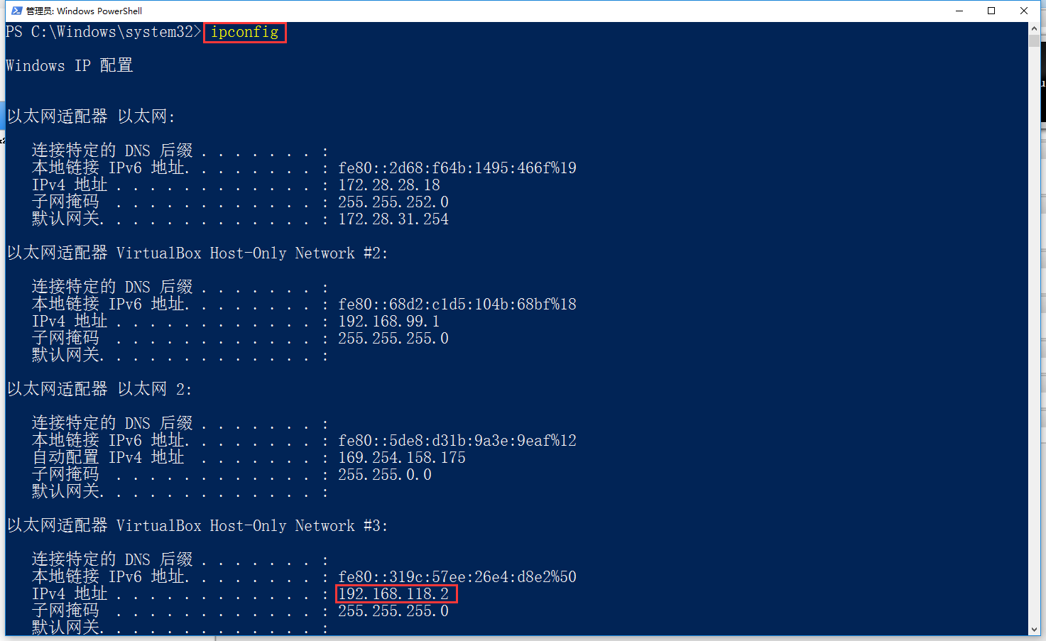 5、打开 Windows PowerShell,执行命令:ipconfig,查看最后一个 VirtualBox Host-Only Network #3,如图5