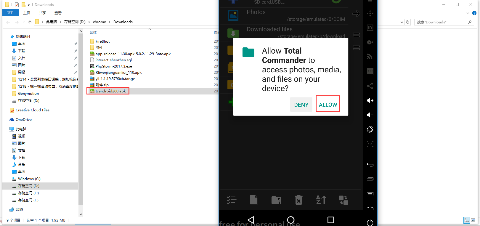 19、拖拽 tcandroid280.apk 至 虚拟设备中,点击 Allow 按钮,如图19