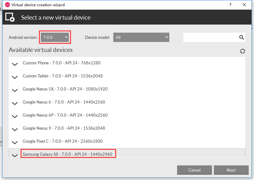 2、安装完毕后,新建一个虚拟设备,Android version 选择 7.0.0,最终选择 Samsung Galaxy S8 – 7.0.0,下一步,如图2