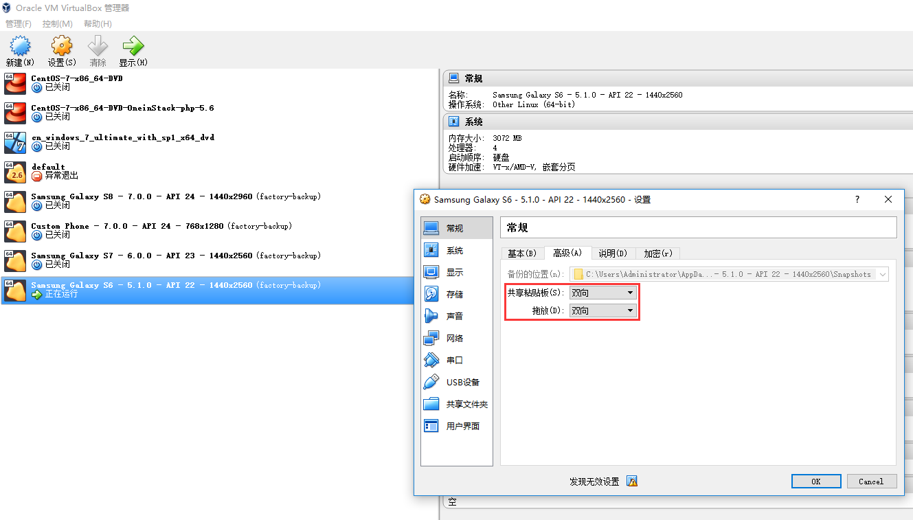 26、由于需要复制网址至虚拟设备中,在VirtualBox中,Samsung Galaxy S6 – 5.1.0,常规 – 高级 – 共享粘贴板与拖放 – 双向,如图32