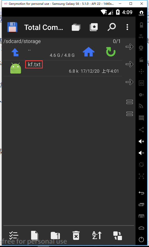 29、在虚拟设备中,/sdcard/storage/kf.txt已经存在,如图34