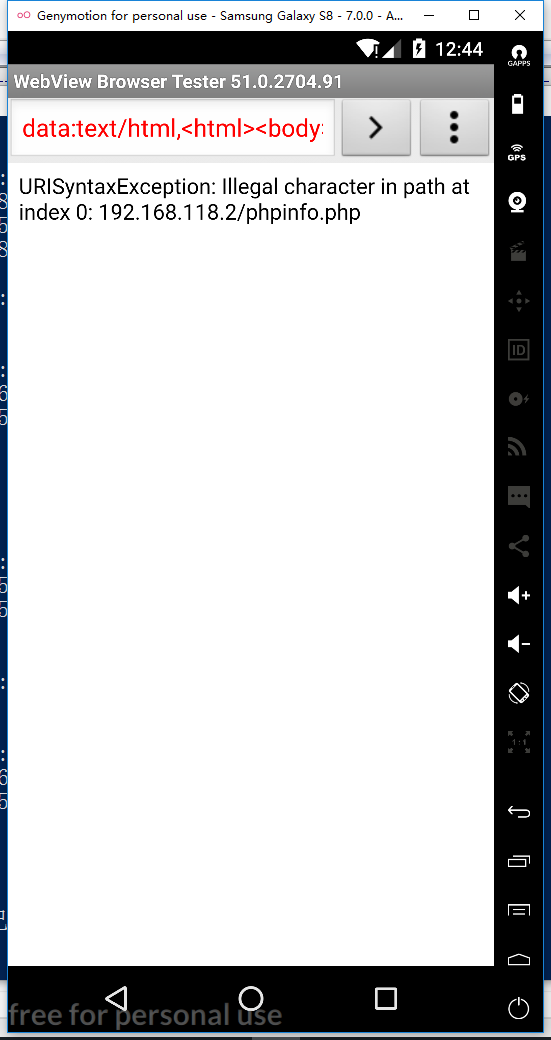 6、打开网址:192.168.118.2/phpinfo.php,报错:URISyntaxException: Illegal character in path at index 0: 192.168.118.2/phpinfo.php,如图6