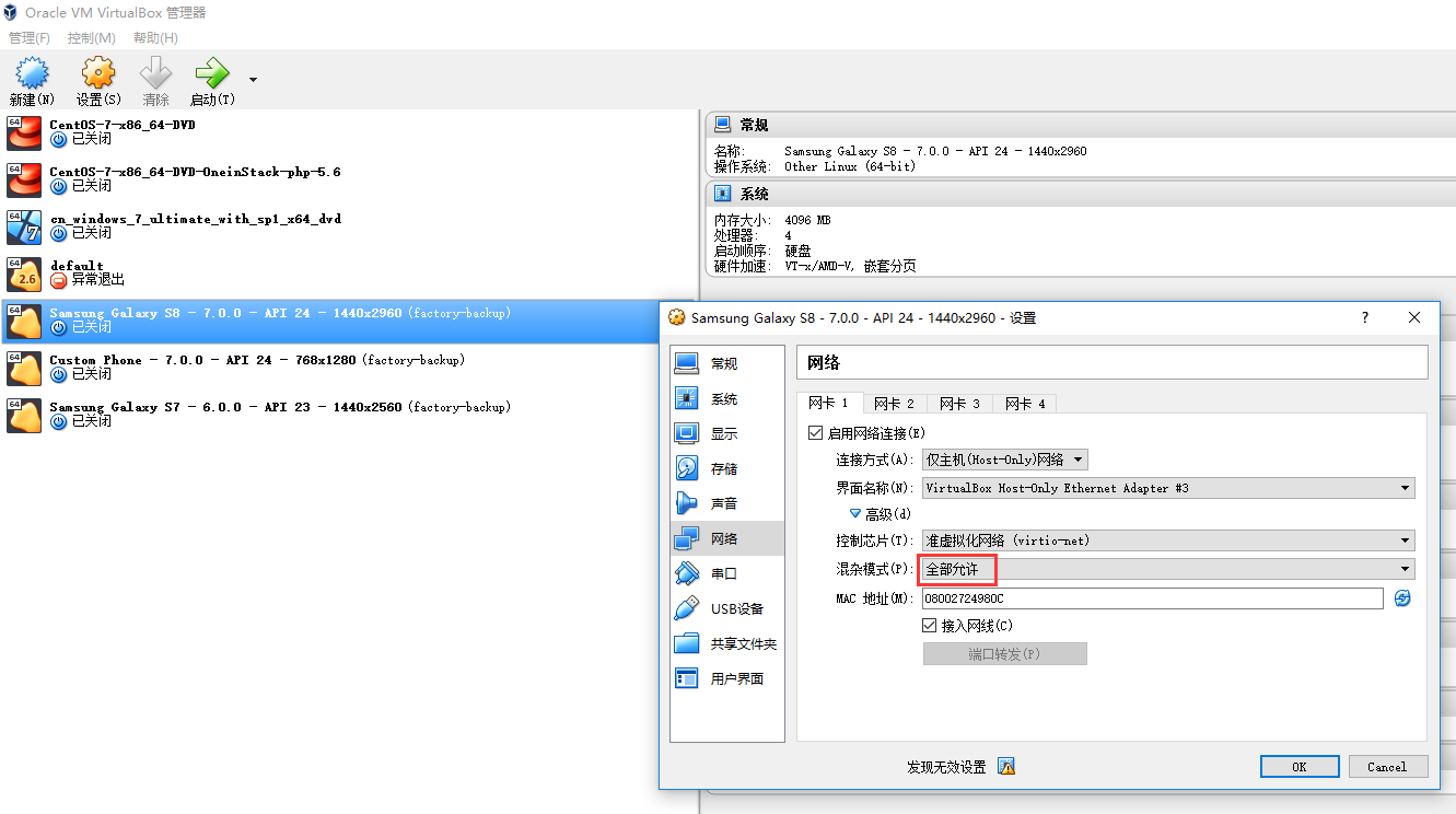 7、打开 Oracle VM VirtualBox,设置 Samsung Galaxy S8 – 7.0.0 的网络,网卡1,混杂模式:全部允许,如图7