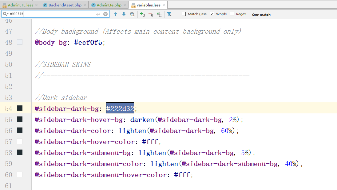 12、在 \vendor\bower\admin-lte\build\less\variables.less 中搜索 #222d32,如图10