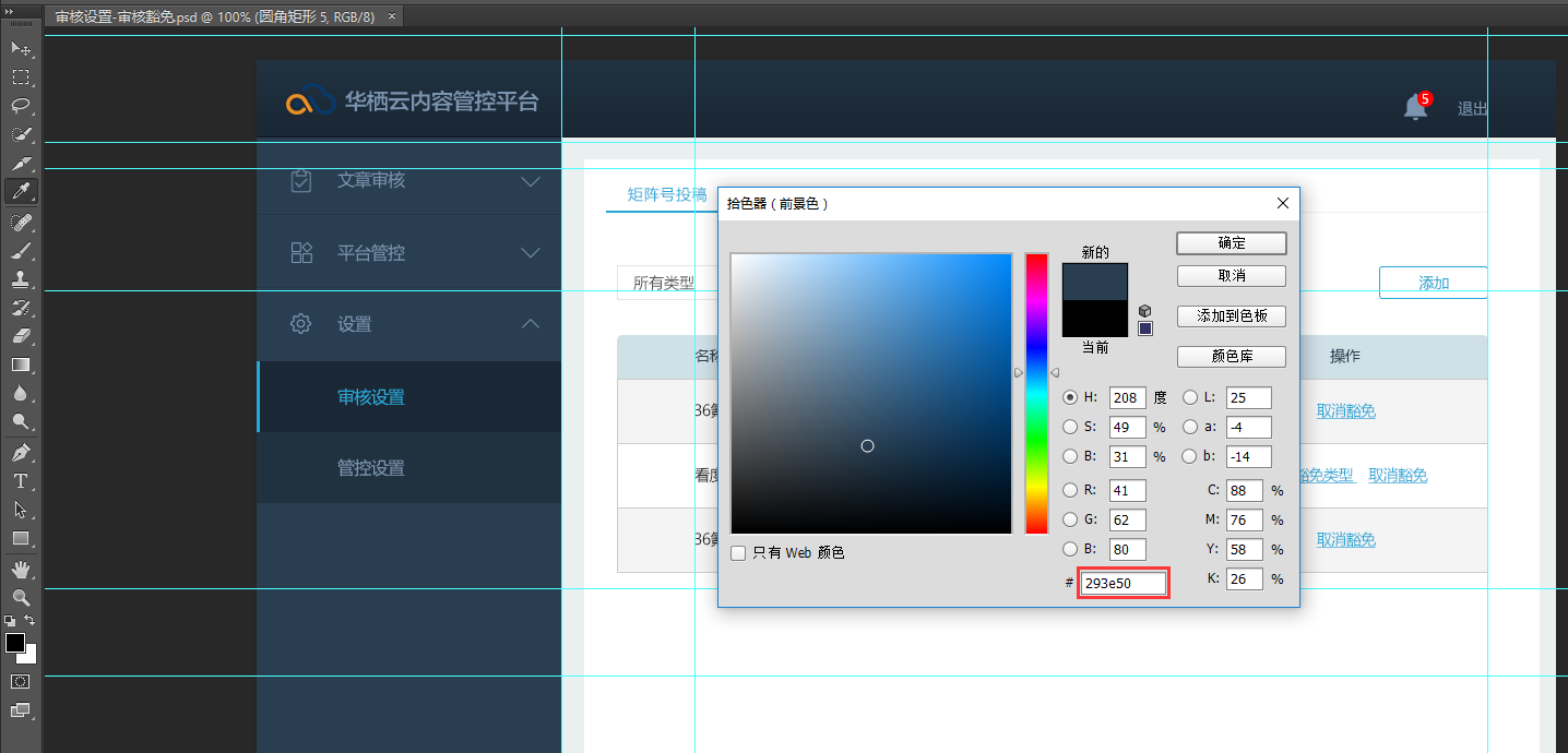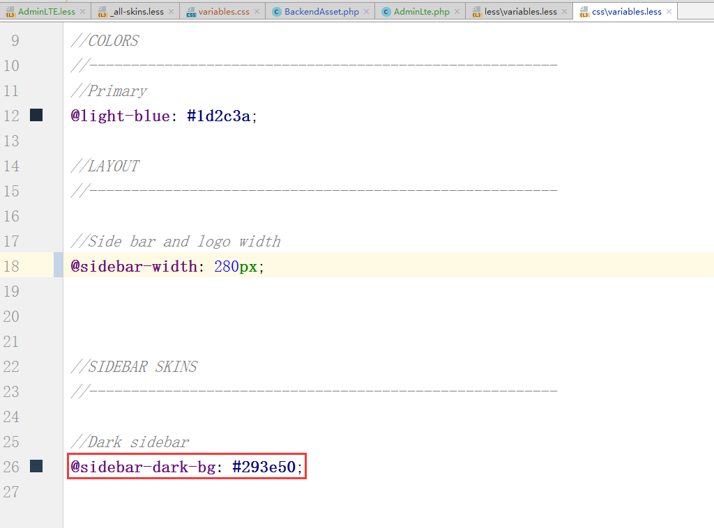 13、将 @sidebar-dark-bg: #222d32; 复制至 \backend\web\themes\default\css\variables.less,调整为:@sidebar-dark-bg: #293e50;,其他几个变量类似地调整,如图11