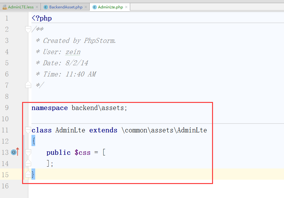 7、新建:\backend\assets\AdminLte.php,继承至 \common\assets\AdminLte,设置$css为空数组,因为需要设置less变量,重新生成对应的CSS文件,所以默认的CSS文件需要去掉,如图5