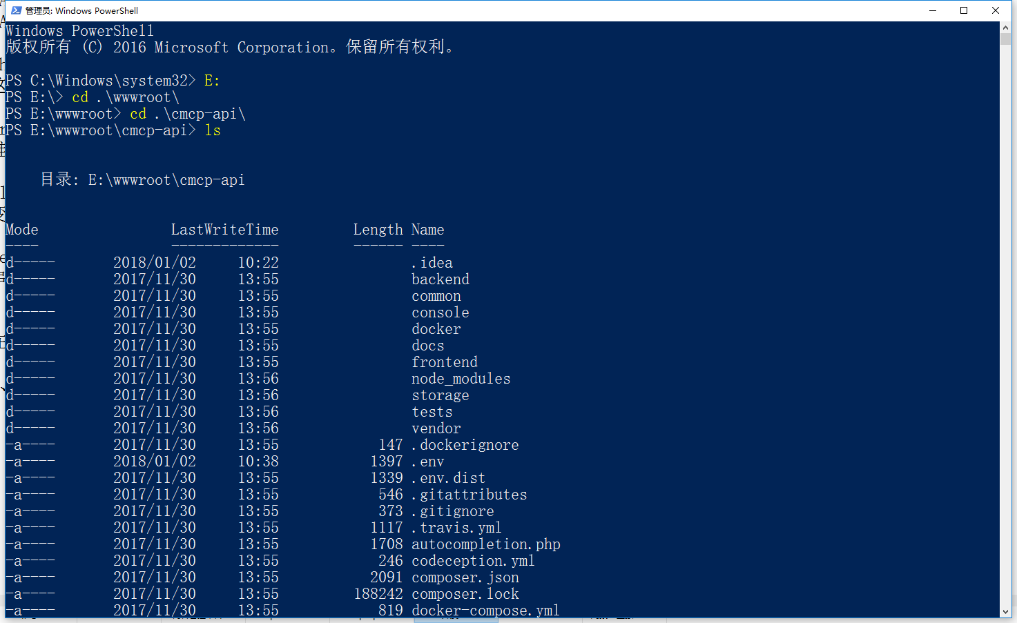 1、在 Windows PowerShll 中,进入 E:\wwwroot\cmcp-api 目录,如图1