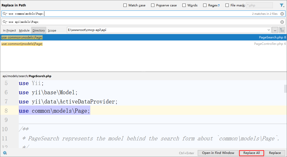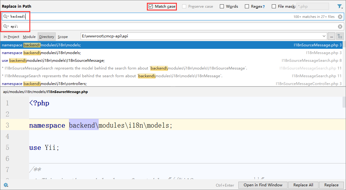 11、在目录api中搜索backend\、backend/、=> ‘backend’、BACKEND,严格匹配大小写,将其分别替换为api\、api/、=> ‘api’、API,如图11