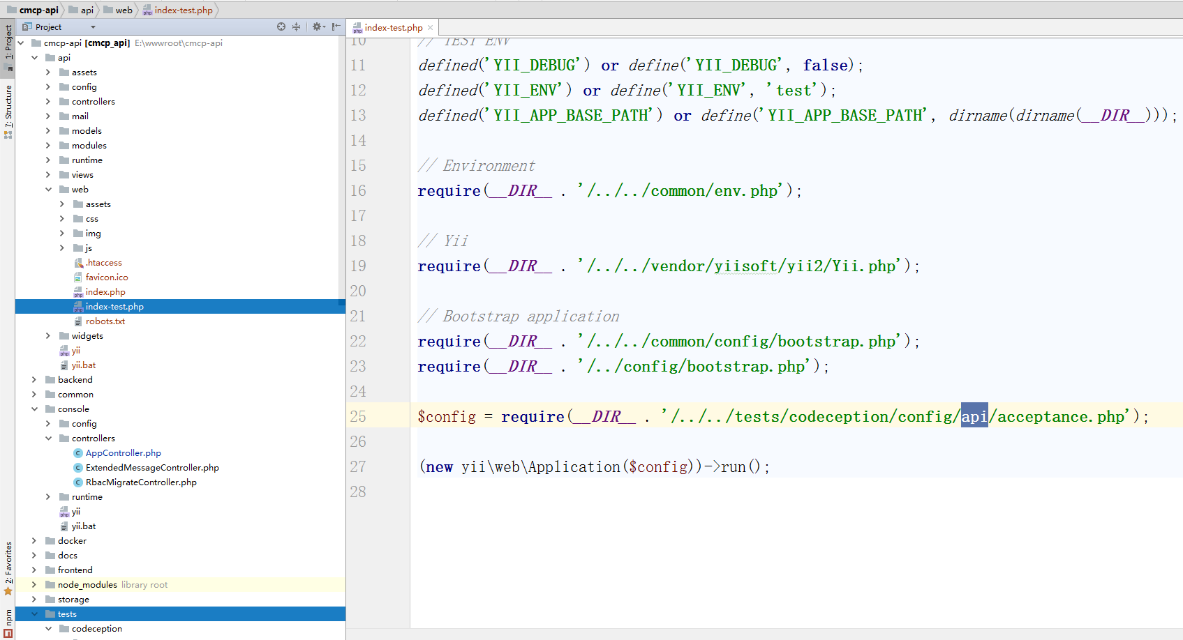 12、在 \tests 目录中,还有相应的与新增接口应用相关的配置,此部分暂缓一下,到需要进行自动化测试的时候,再来进行配置了。查看 \api\web\index-test.php,如图12