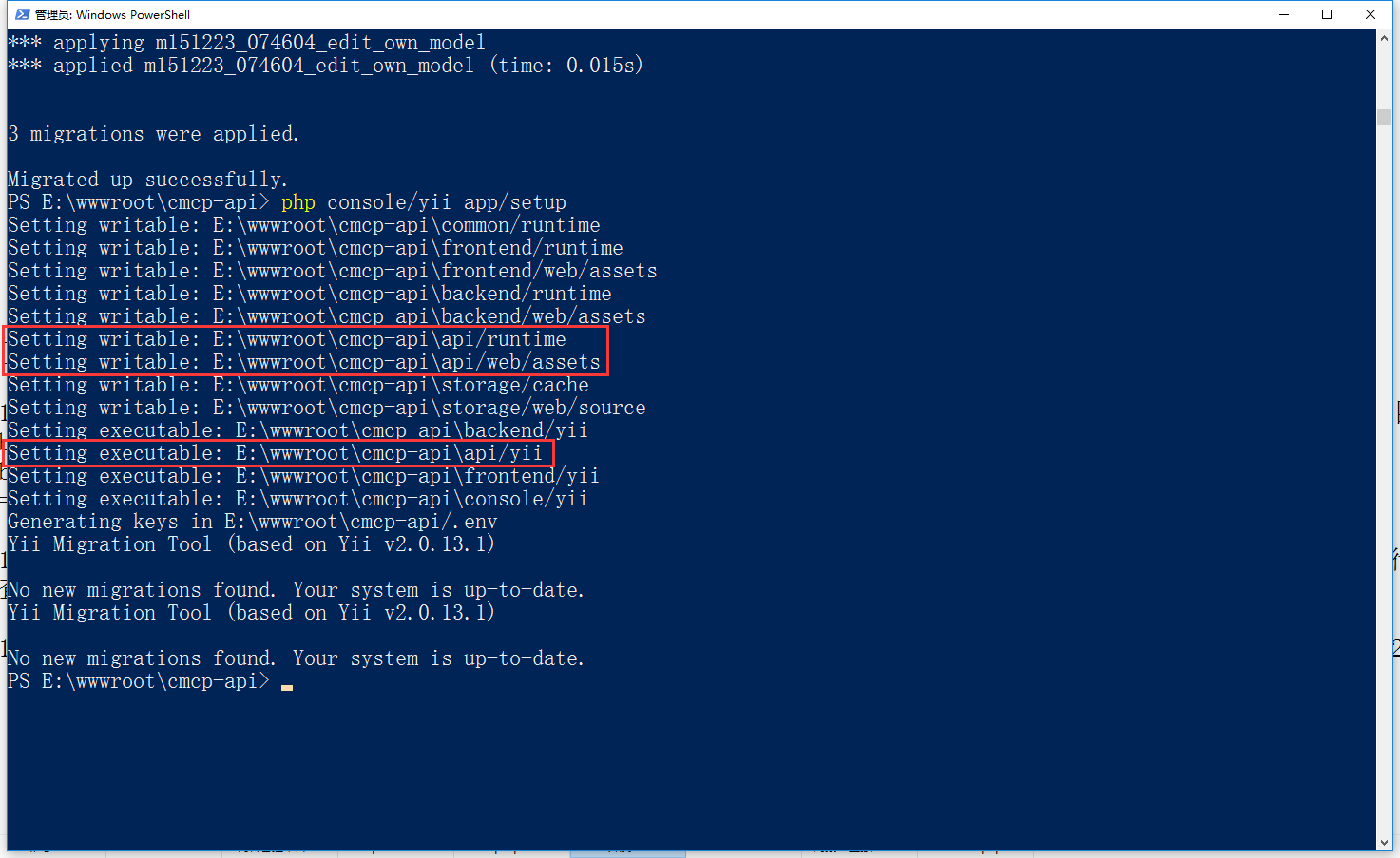 13、在 Windows PowerShll 中,进入 E:\wwwroot\cmcp-api 目录,再次运行命令:php console/yii app/setup,设置可写、可执行权限,如图13