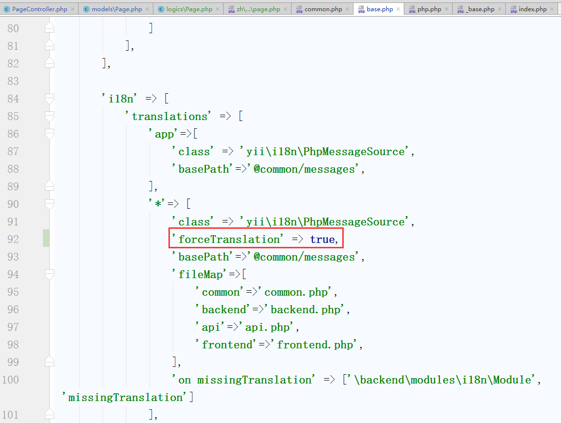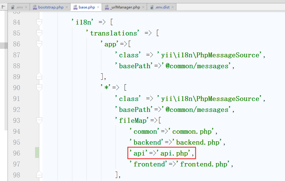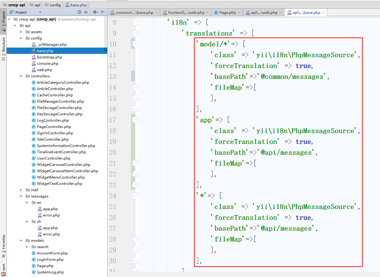 6、编辑 \common\config\base.php,配置接口应用的语言包文件,如图6