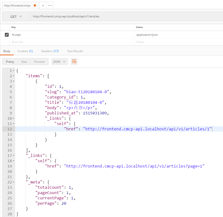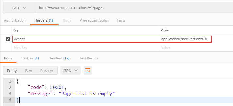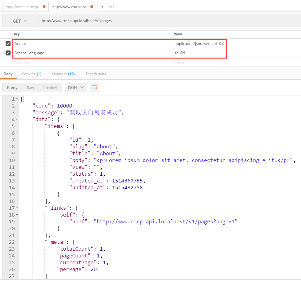 95、OPTIONS /pages: 显示关于末端 /pages 支持的动词,在 Postman 中,OPTIONS http://www.cmcp-api.localhost/v1/pages ,200响应,如图95