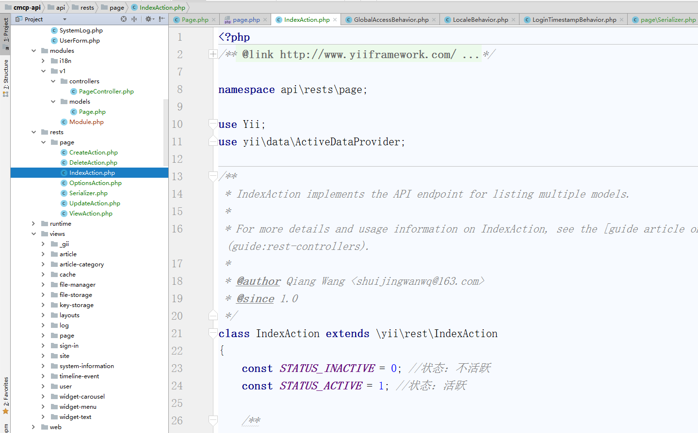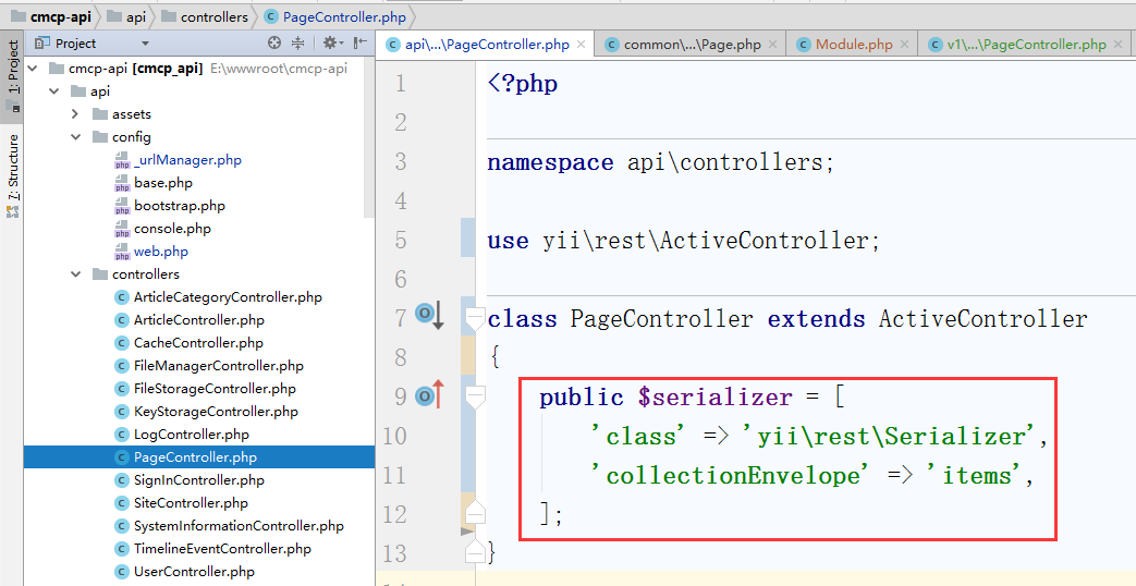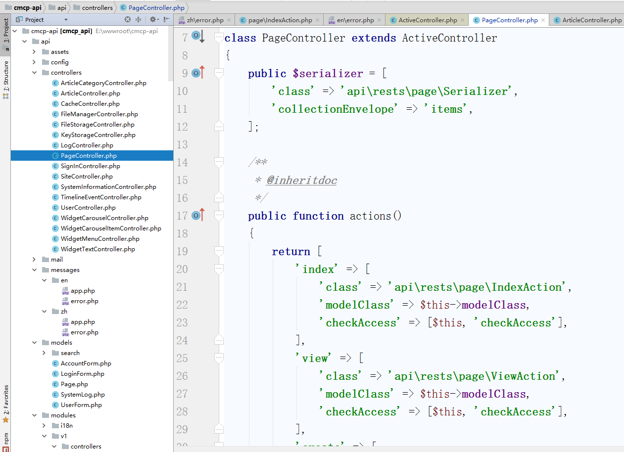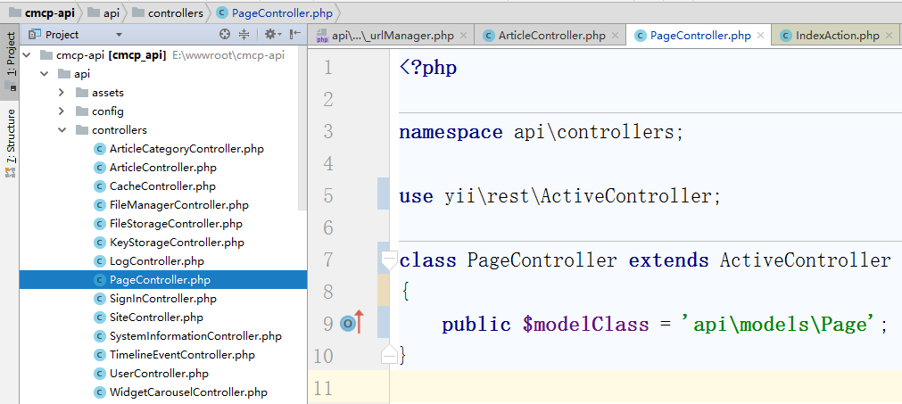 ![编辑控制器类 \api\controllers\PageController.php ,控制器类扩展自 [[yii\rest\ActiveController]]。 通过指定 [[yii\rest\ActiveController::modelClass|modelClass]] 作为 api\models\Page, 控制器就能知道使用哪个模型去获取和处理数据。](http://www.shuijingwanwq.com/wp-content/uploads/2018/01/40.png)