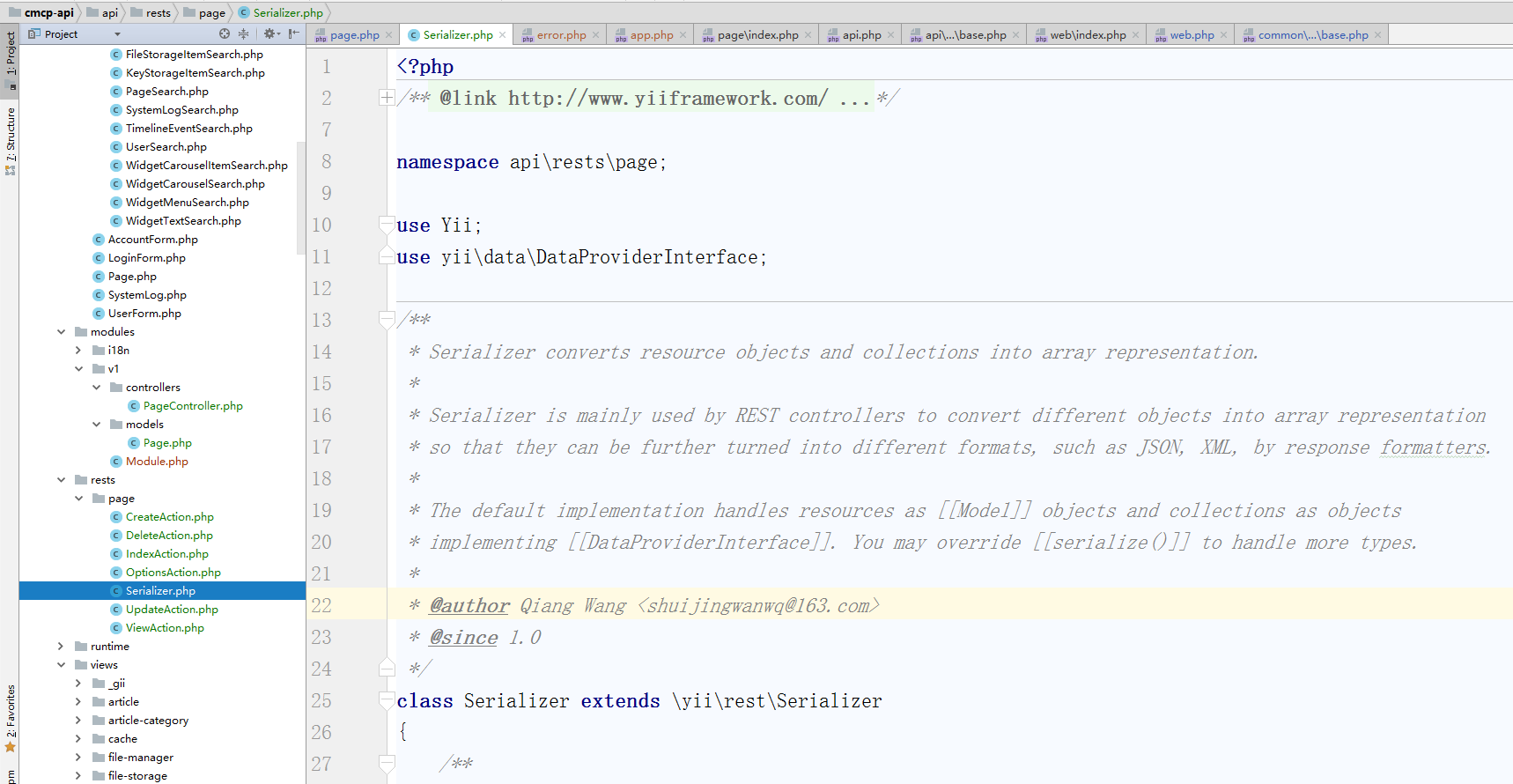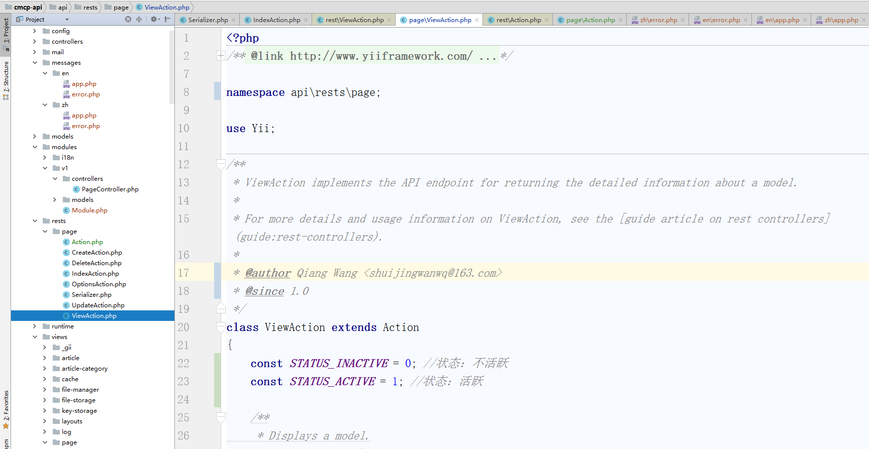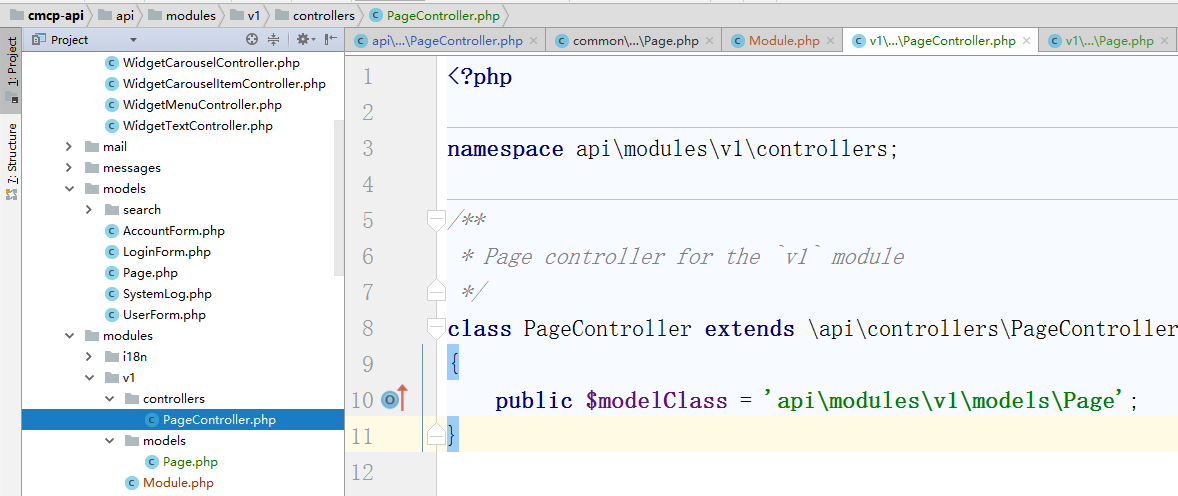 ![编辑控制器类 \api\controllers\PageController.php ,控制器类扩展自 [[yii\rest\ActiveController]]。 通过指定 [[yii\rest\ActiveController::modelClass|modelClass]] 作为 api\models\Page, 控制器就能知道使用哪个模型去获取和处理数据。](http://www.shuijingwanwq.com/wp-content/uploads/2018/01/40.png)