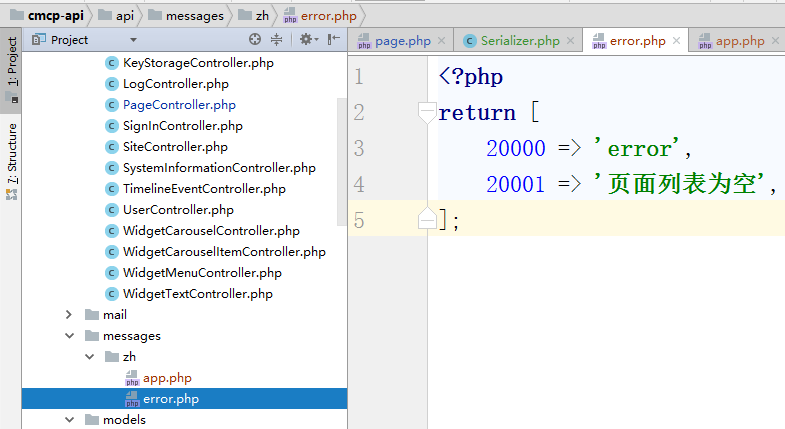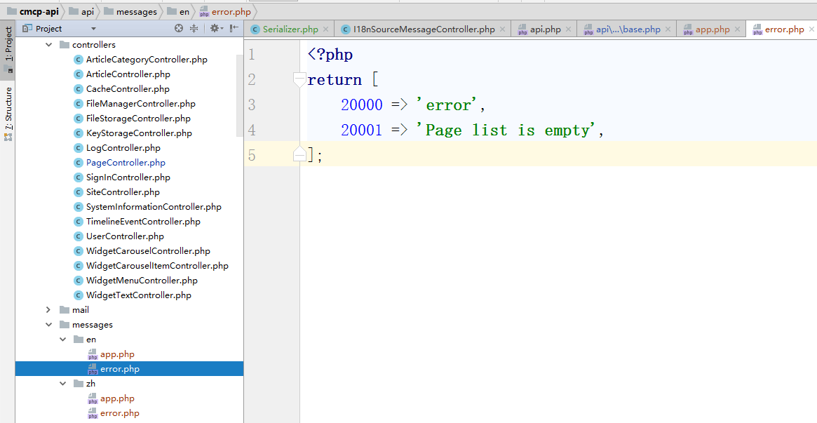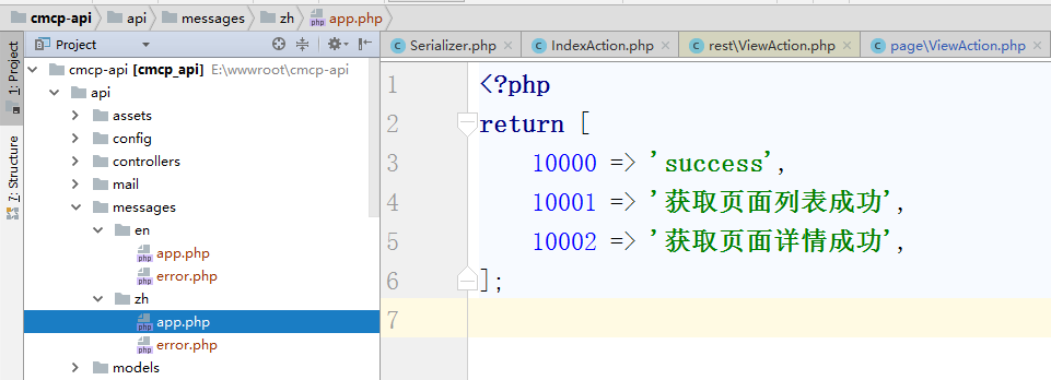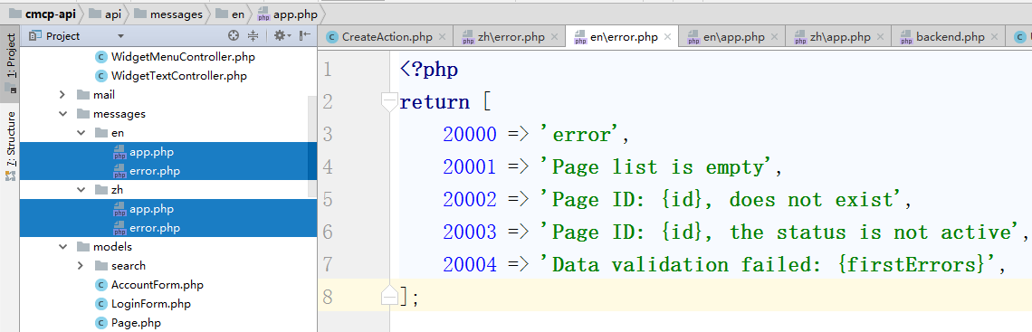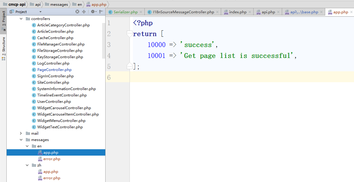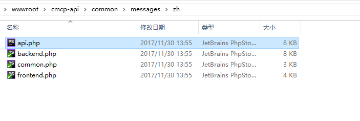 7、新建接口应用的中文语言包文件,复制 \common\messages\zh\backend.php 为 \common\messages\zh\api.php(如果需要支持其他的语言,可以在其他的语言目录下新建),如图7