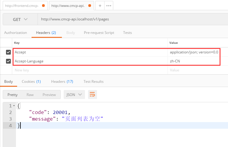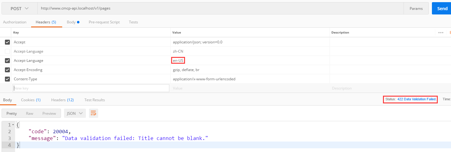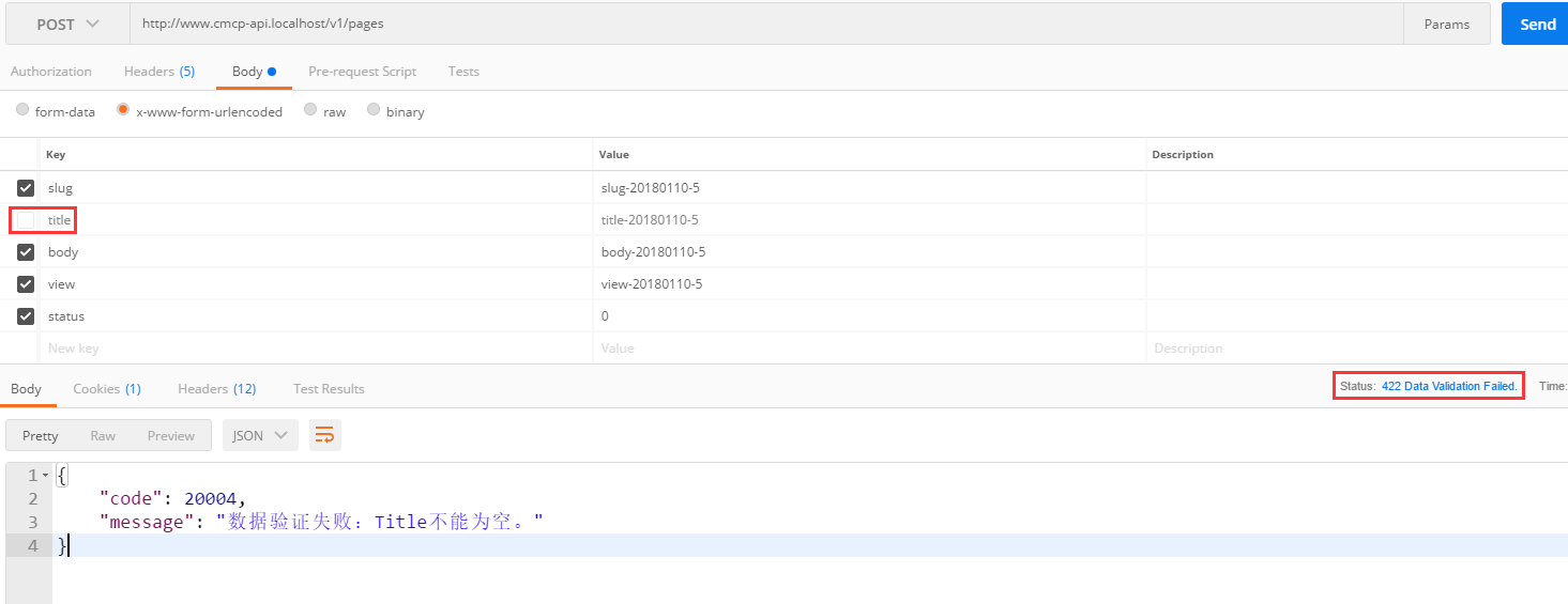 86、在 Postman 中,POST http://www.cmcp-api.localhost/v1/pages ,参数保持原样,422响应,如图86