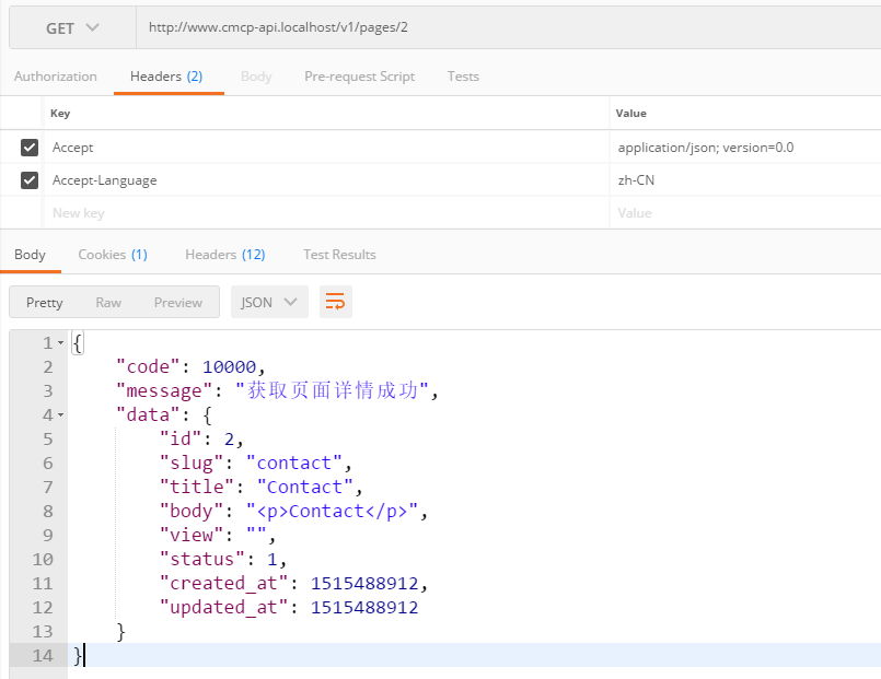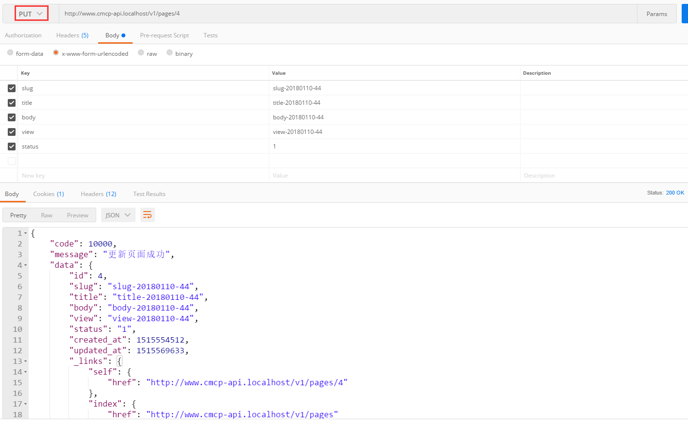 90、在 Postman 中,PUT http://www.cmcp-api.localhost/v1/pages/4 ,200响应,如图90