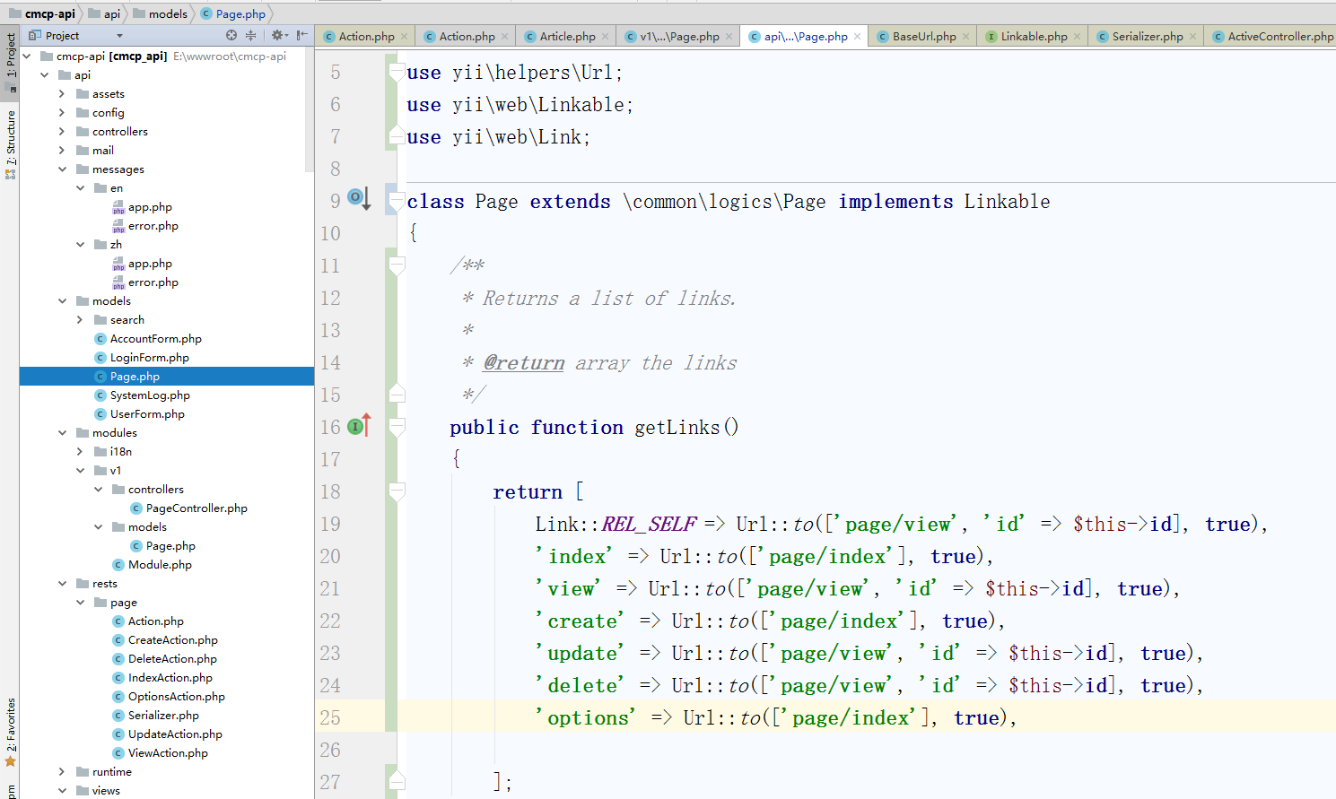 ![实现[[yii\web\Linkable]] 接口来支持HATEOAS,返回与本资源对象的相关链接,编辑资源类 \api\models\Page.php](http://www.shuijingwanwq.com/wp-content/uploads/2018/01/82.png)