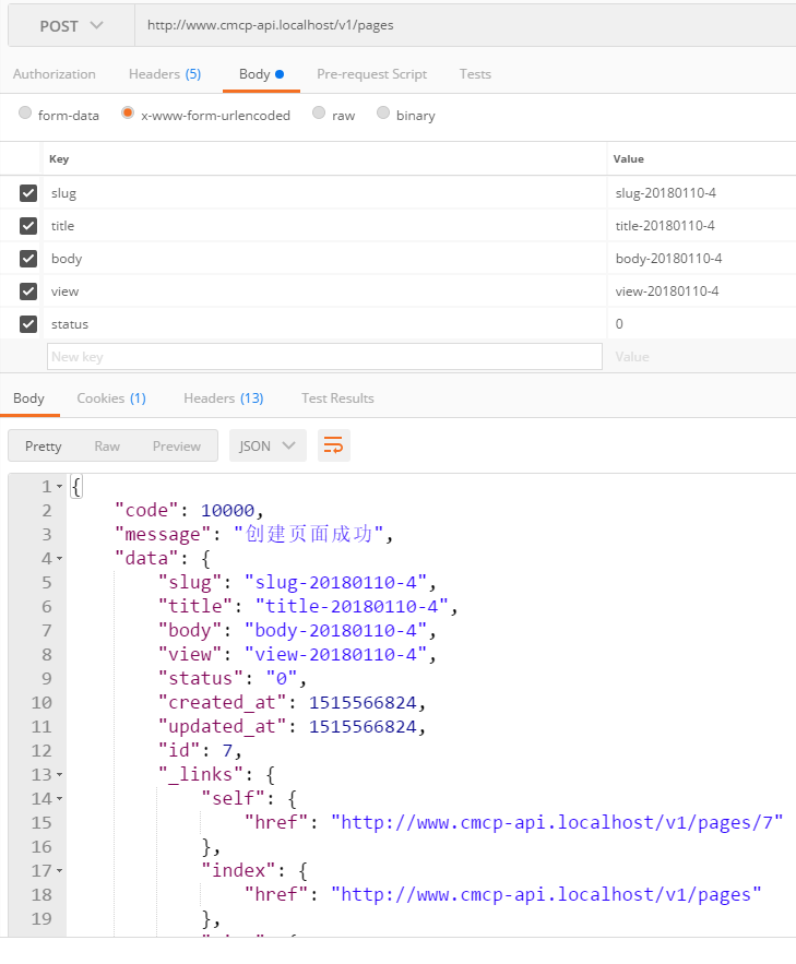 85、在 Postman 中,POST http://www.cmcp-api.localhost/v1/pages ,201响应,如图85