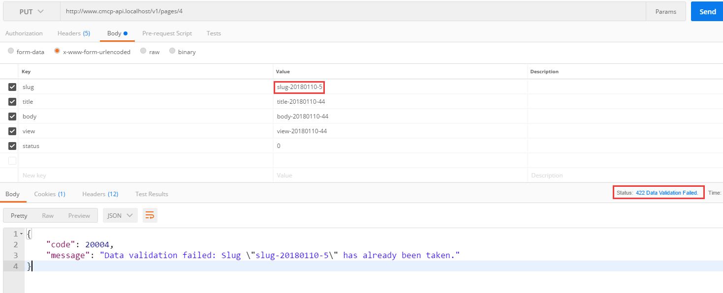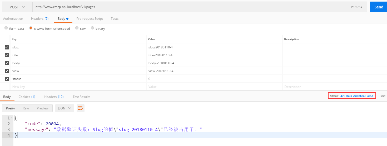 "message": "数据验证失败:Slug的值\"slug-20180110-4\"已经被占用了。"