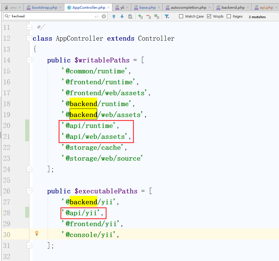 9、编辑 \console\controllers\AppController.php,搜索此文件有6处backend,则相应复制3份为api,如图9