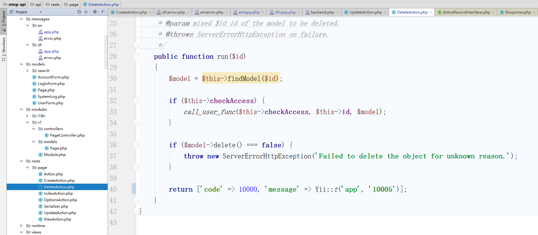 92、DELETE /pages/4: 删除页面4,编辑 \api\rests\page\DeleteAction.php,如图92