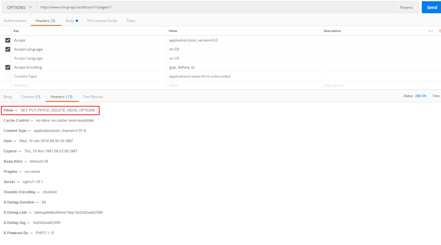 96、OPTIONS /pages/1: 显示关于末端 /pages/1 支持的动词,在 Postman 中,OPTIONS http://www.cmcp-api.localhost/v1/pages/1 ,200响应,如图96