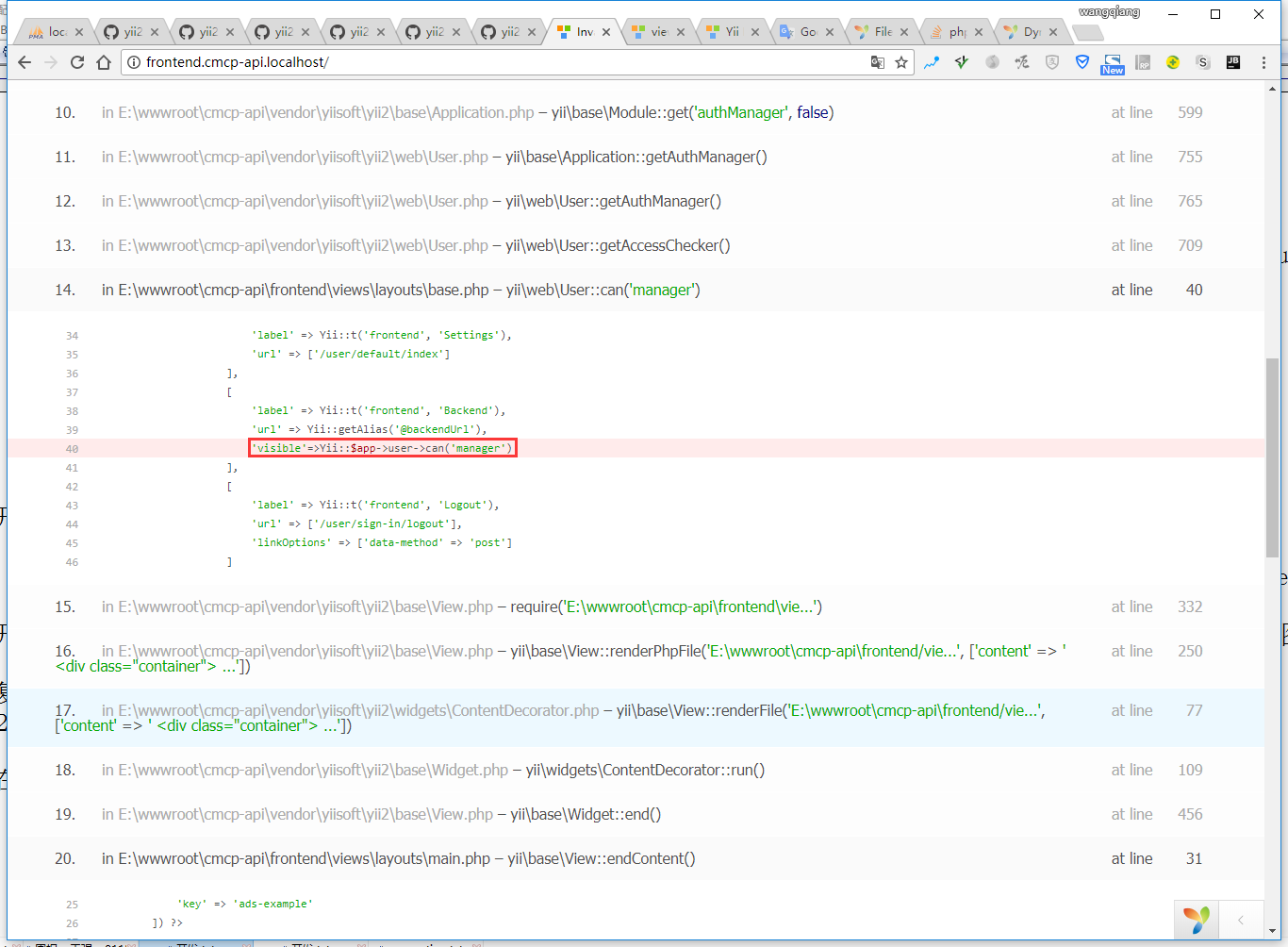 17、打开:http://frontend.cmcp-api.localhost/ ,报错:Failed to instantiate component or class “db”.,原因在于 RBAC 组件使用数据库表存放数据,如图10
