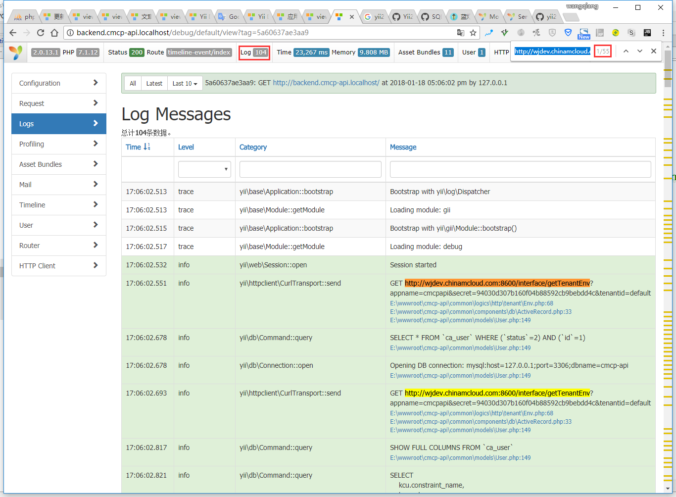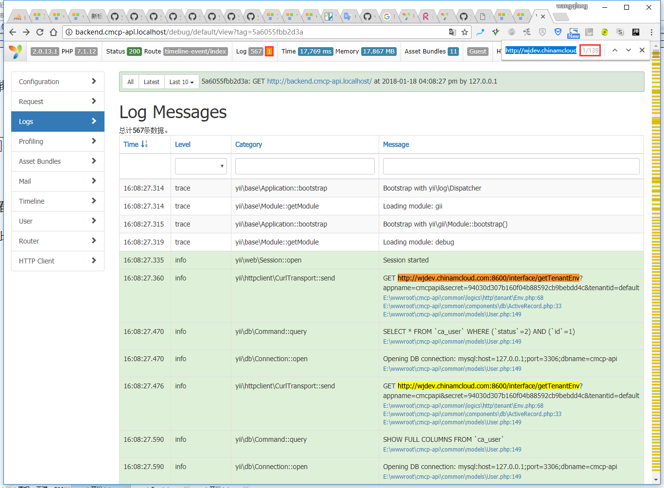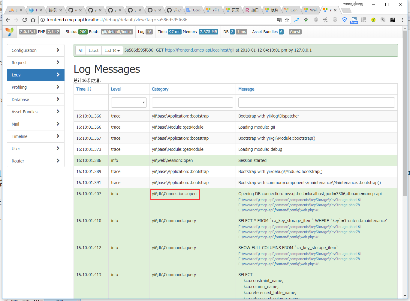 3、打开 Dubug,然后查看 Log Messages,db 组件的属性需要在 yii\db\Connection::open 之前完成初始化定义(调用多租户系统的接口),如图3