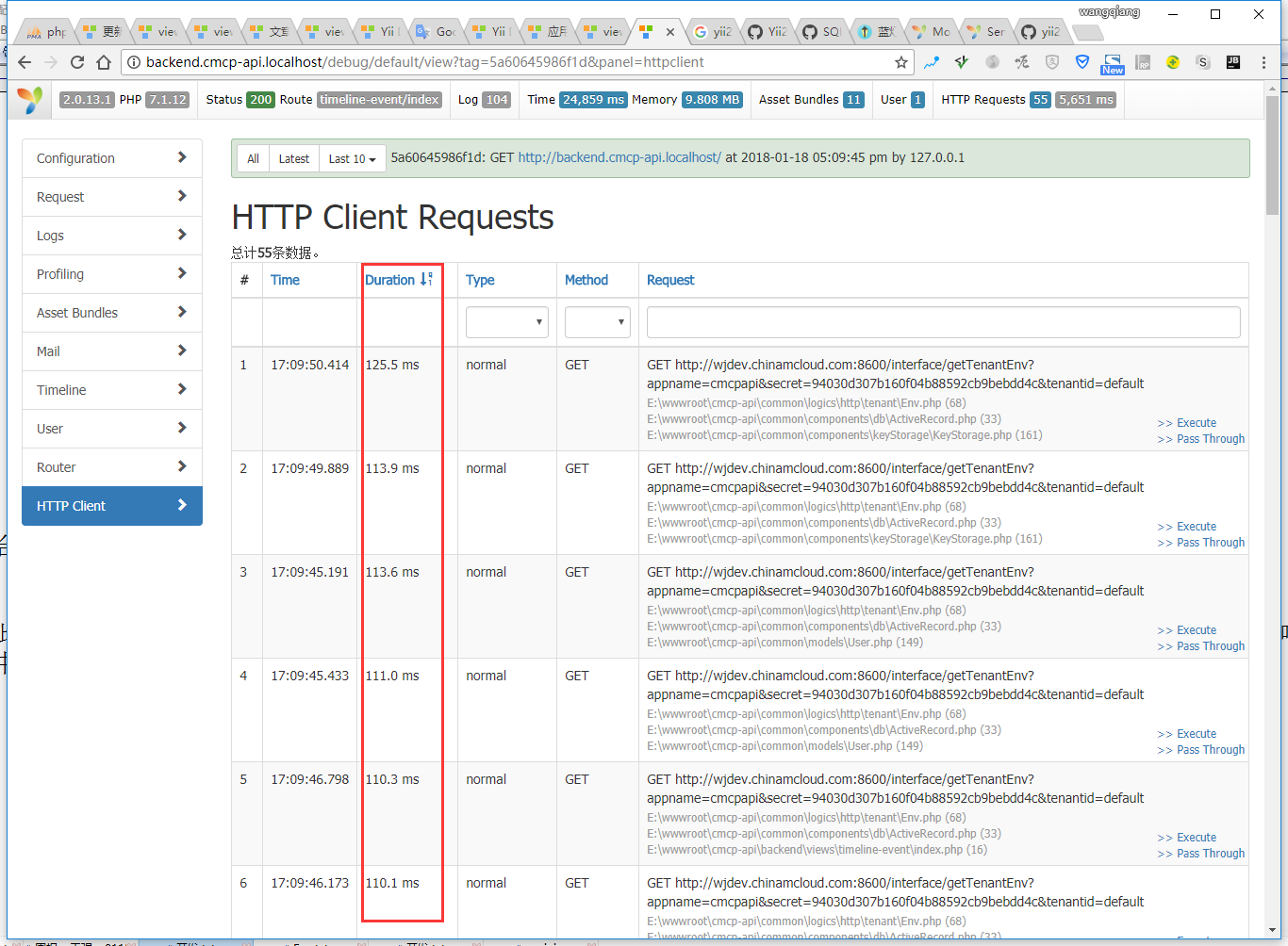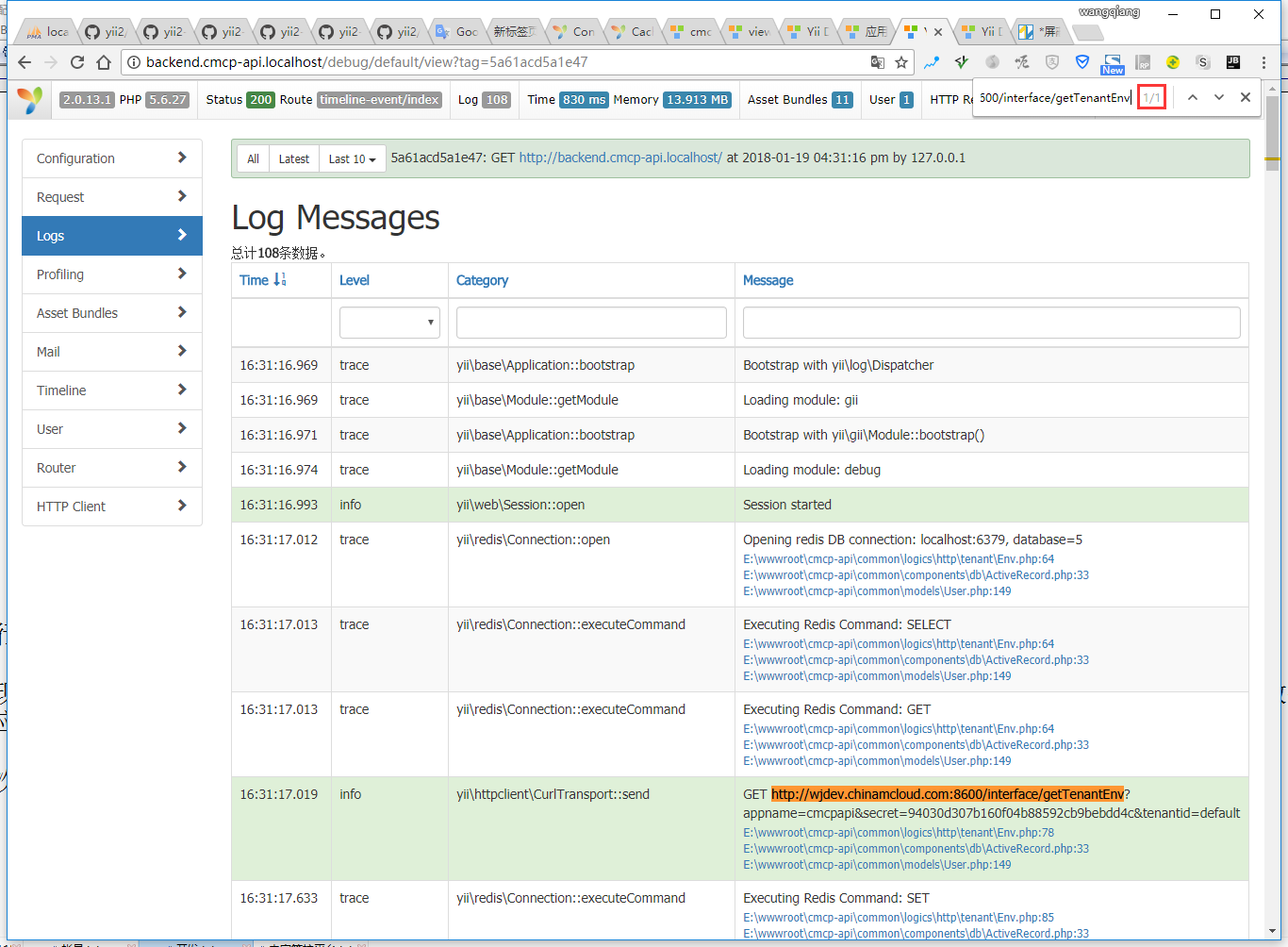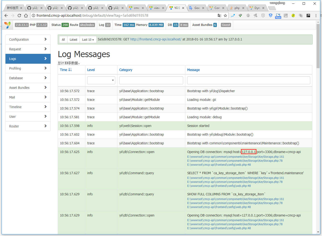 3、打开 Dubug,然后查看 Log Messages,db 组件的属性需要在 yii\db\Connection::open 之前完成初始化定义(调用多租户系统的接口),如图3