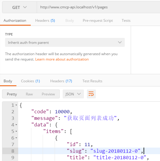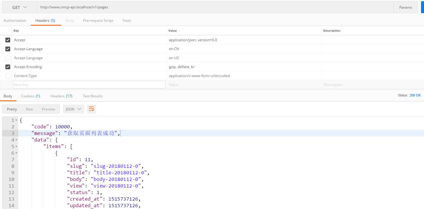 37、在 Postman 中 GET http://www.cmcp-api.localhost/v1/pages ,200响应,如图21