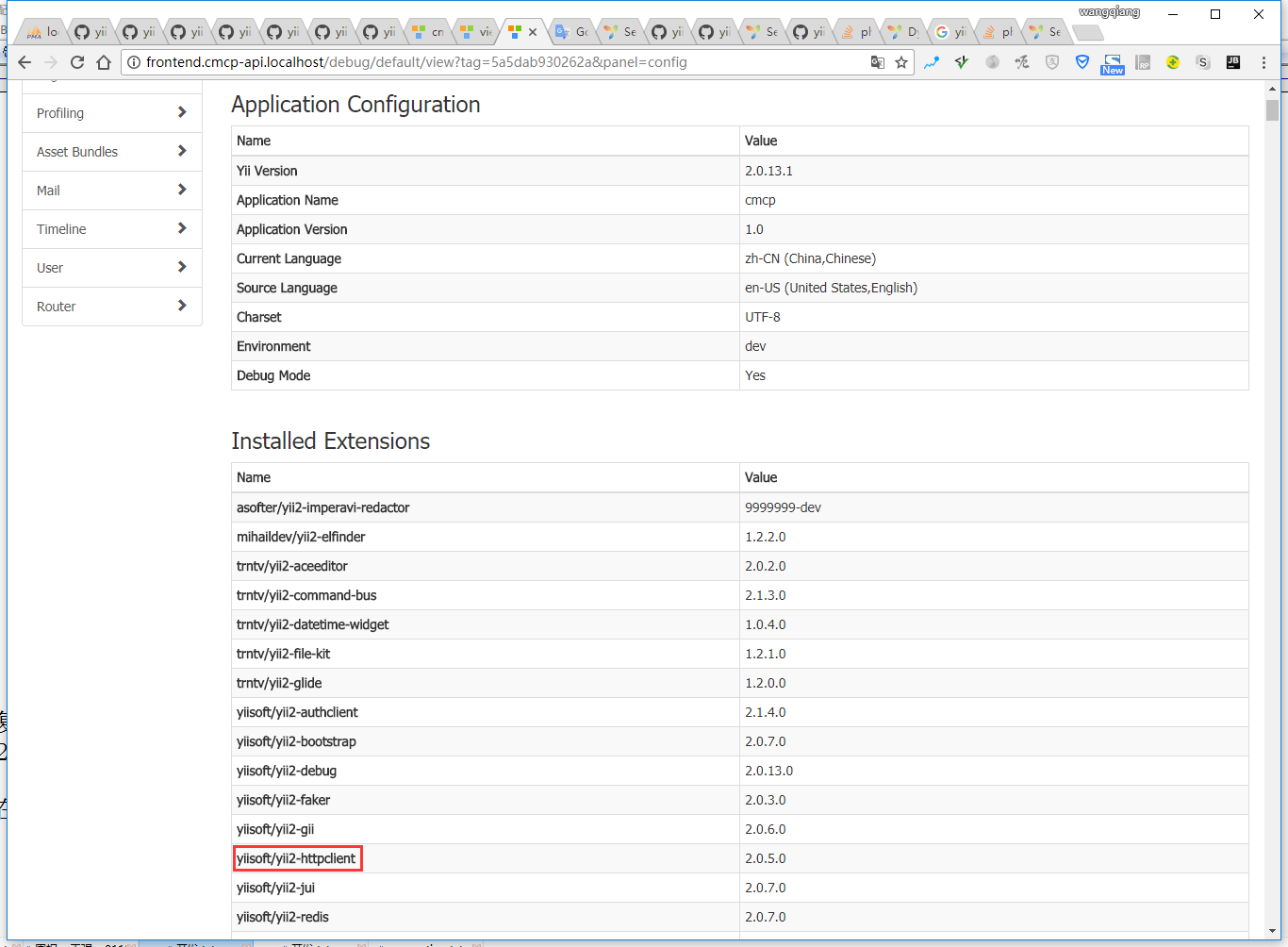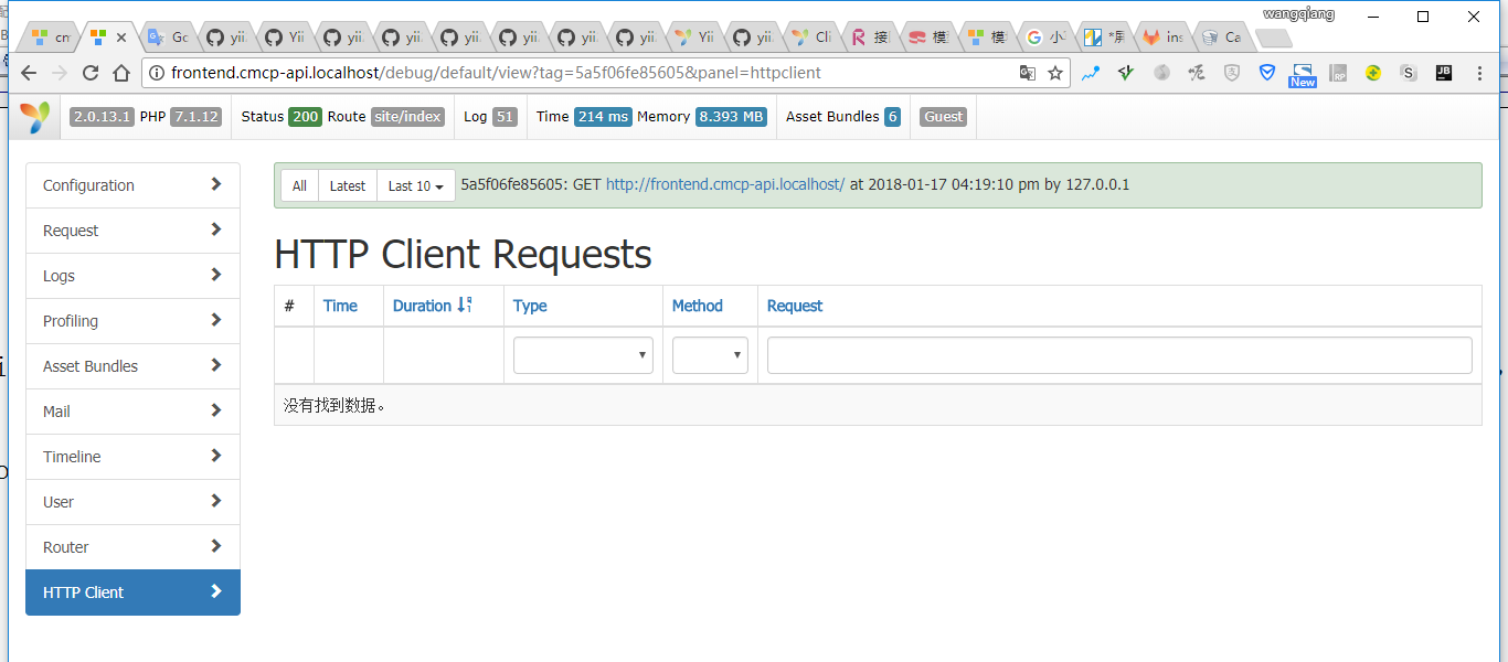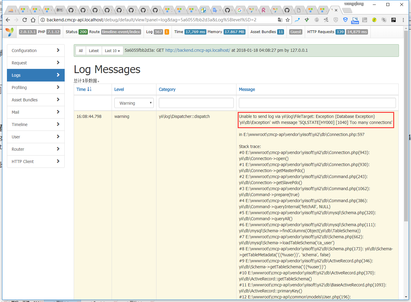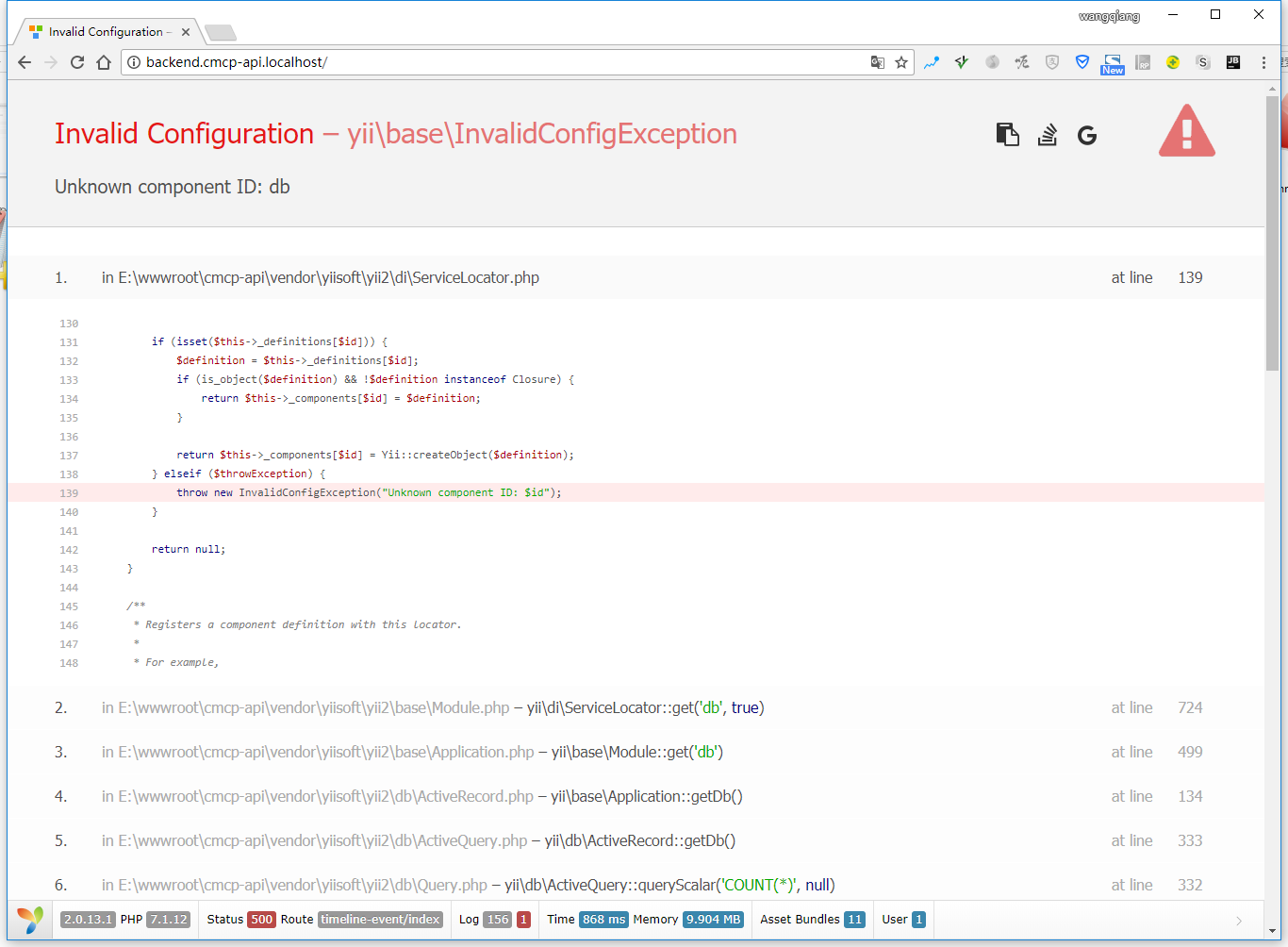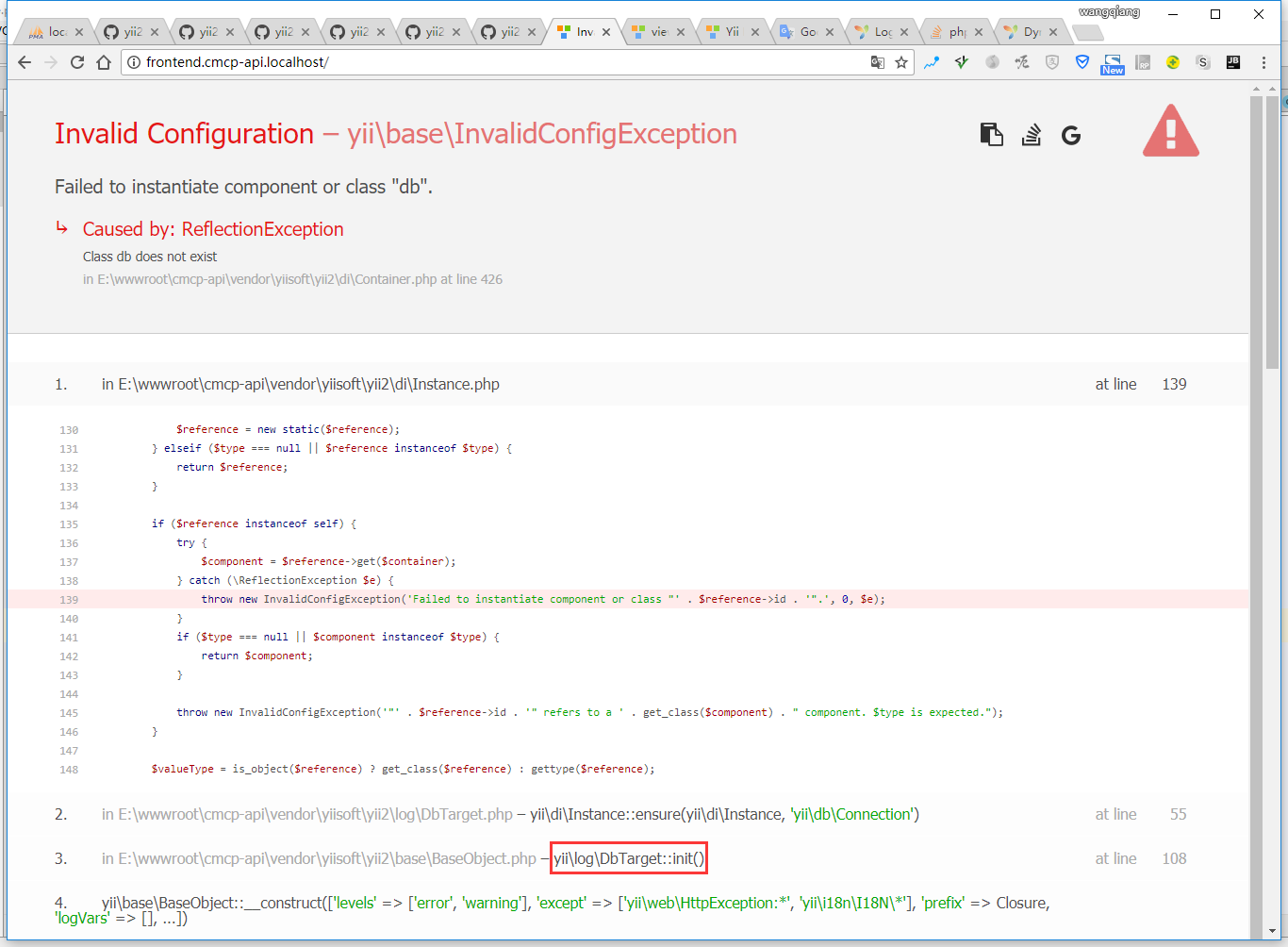 12、打开:http://frontend.cmcp-api.localhost/ ,报错:Failed to instantiate component or class “db”.,原因在于日志目标为数据库表,如图7