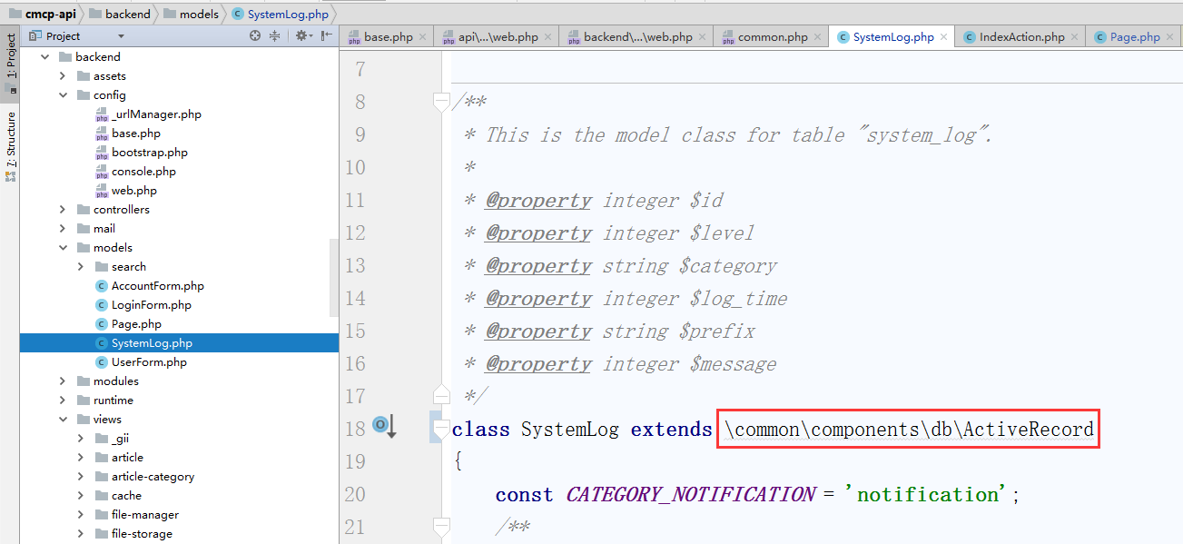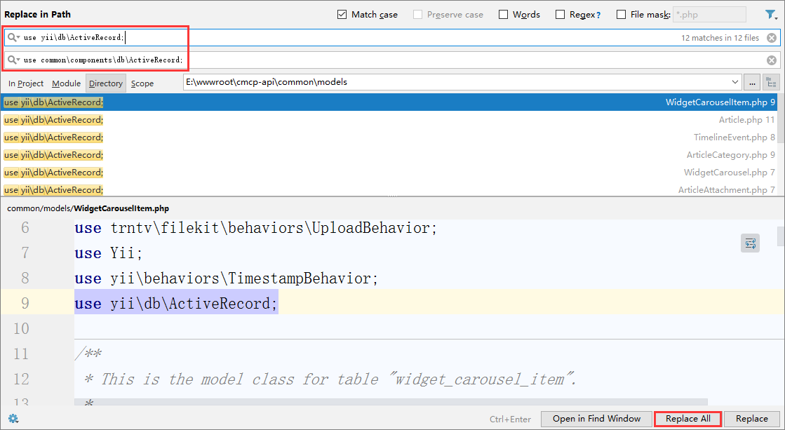16、将 \common\models 下的所有模型文件,use yii\db\ActiveRecord; 替换为 use common\components\db\ActiveRecord;,如图9