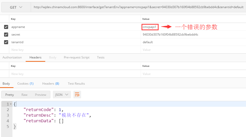 38、在 Postman 中 GET 多租户的环境配置接口,一个参数是错误的,如图22