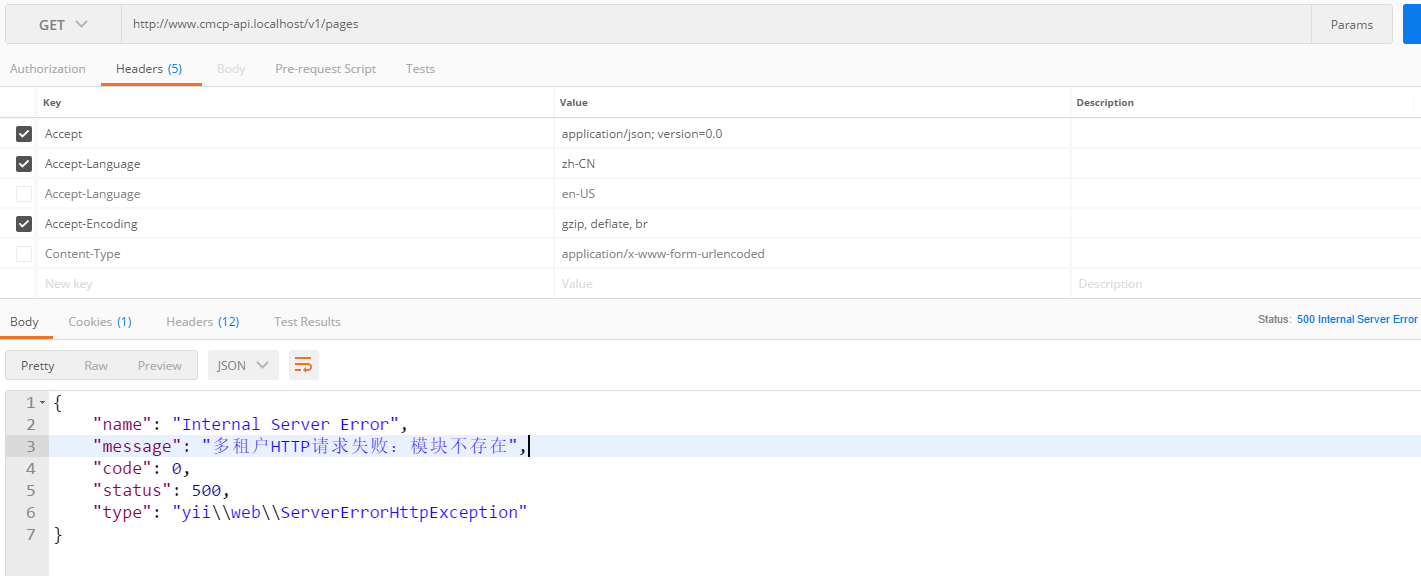 40、在 Postman 中 GET http://www.cmcp-api.localhost/v1/pages ,500响应,如图23
