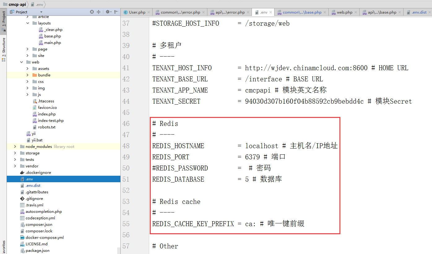 44、至此,数据库连接时的动态配置,配置属性来源于多租户系统已经基本上实现了,后续应该会实现缓存(多租户系统的响应),因为一次请求中,对于多租户系统的HTTP请求多达上百次,而每次HTTP请求平均耗时为100ms左右,如图2845、开启 Schema 缓存(仅在生产环境中开启),且缓存至 Redis 中,编辑 \.env.dist、\.env,如图29
