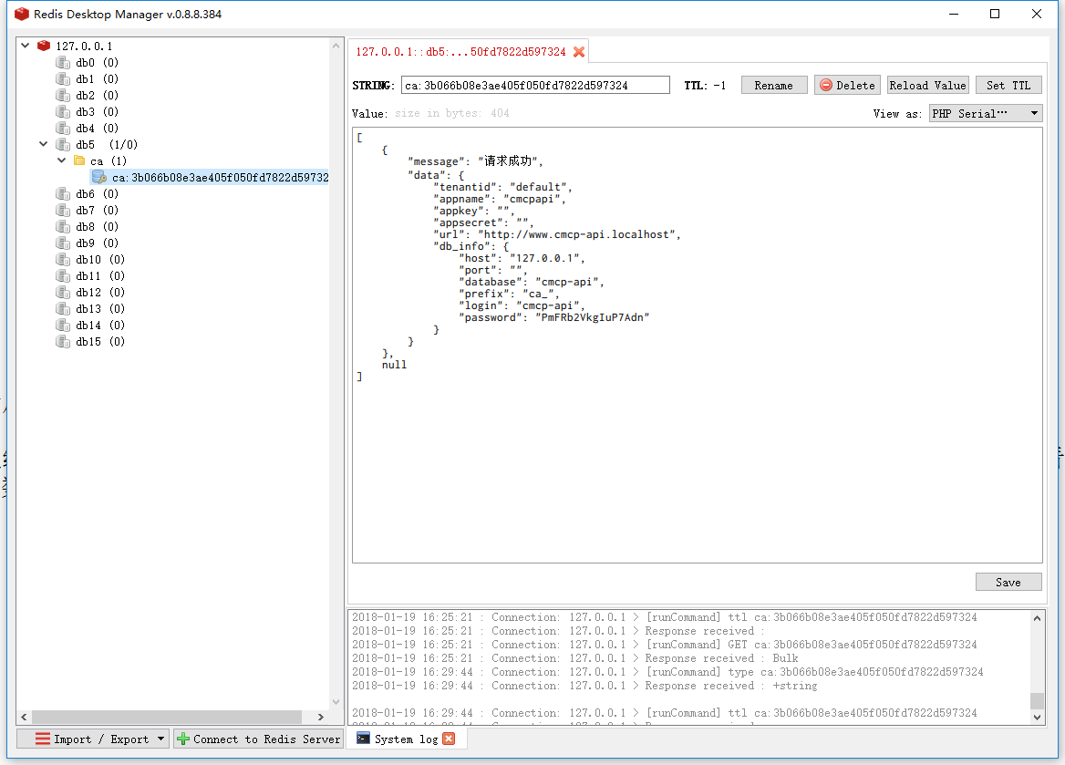 49、实现缓存(多租户系统的响应),编辑 \common\logics\http\tenant\Env.php,运行后台应用后,查看 Redis 中的数据,多租户系统的响应数据已经被缓存了,如图31