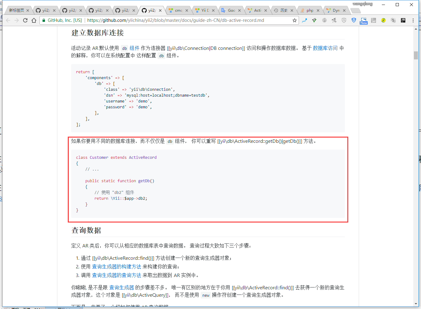 8、现在还原所有修改,准备实现同时使用多个数据库(每个租户对应不同的连接组件,连接组件的命名基于租户ID),参考网址:https://github.com/yiichina/yii2/blob/master/docs/guide-zh-CN/db-active-record.md ,如图6