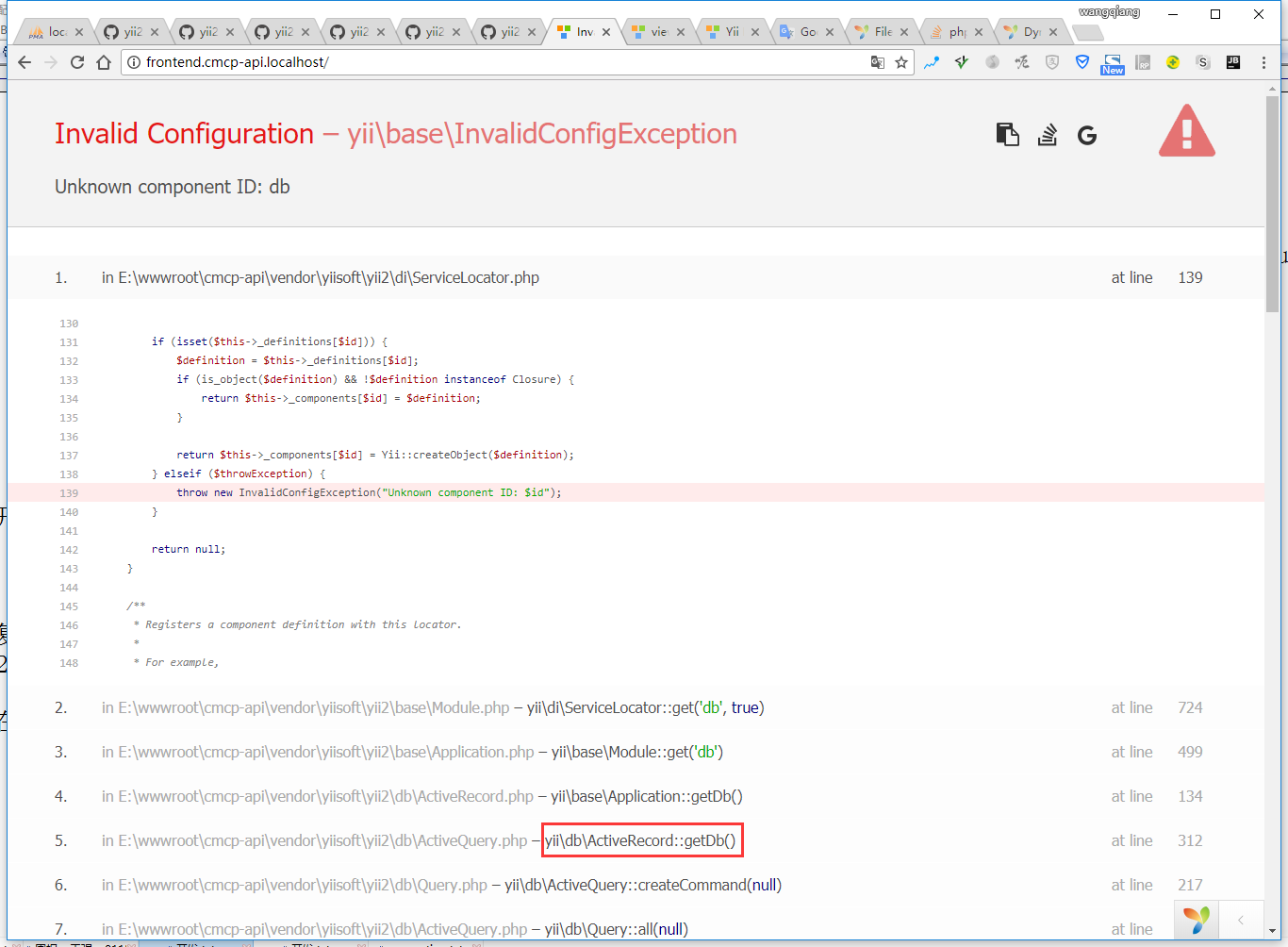 15、打开:http://frontend.cmcp-api.localhost/ ,报错:Unknown component ID: db,如图8